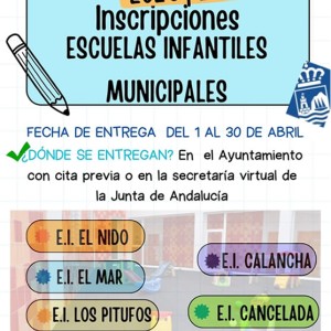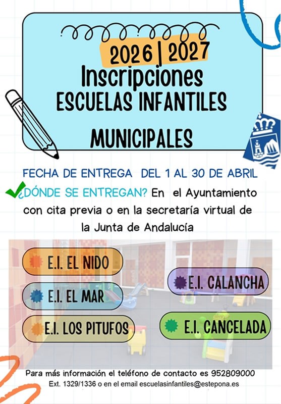 The Estepona City Council informs that on April 1st the admission procedure for the First Cycle of Early Childhood Education in the Municipal Infant Schools El Nido, El Mar, Los Pitufos, Calancha and Cancelada will begin for boys and girls from 0 to 3 years old for the 2026/27 school year.