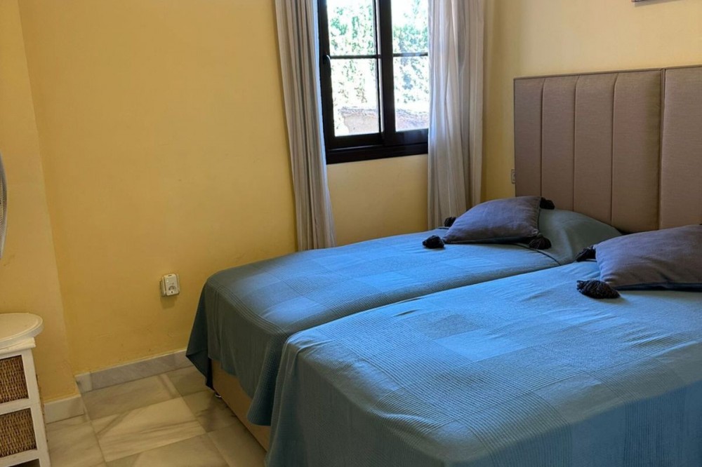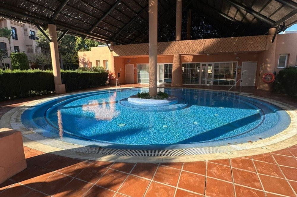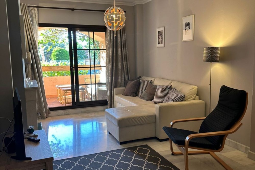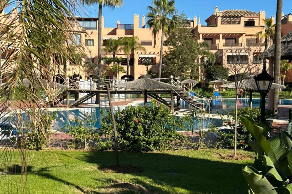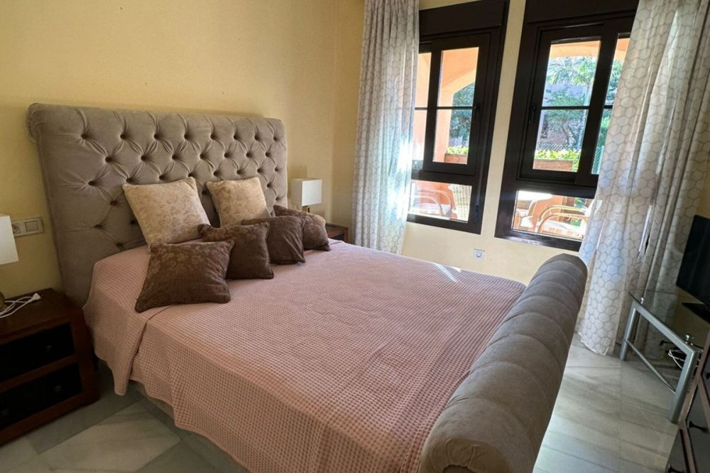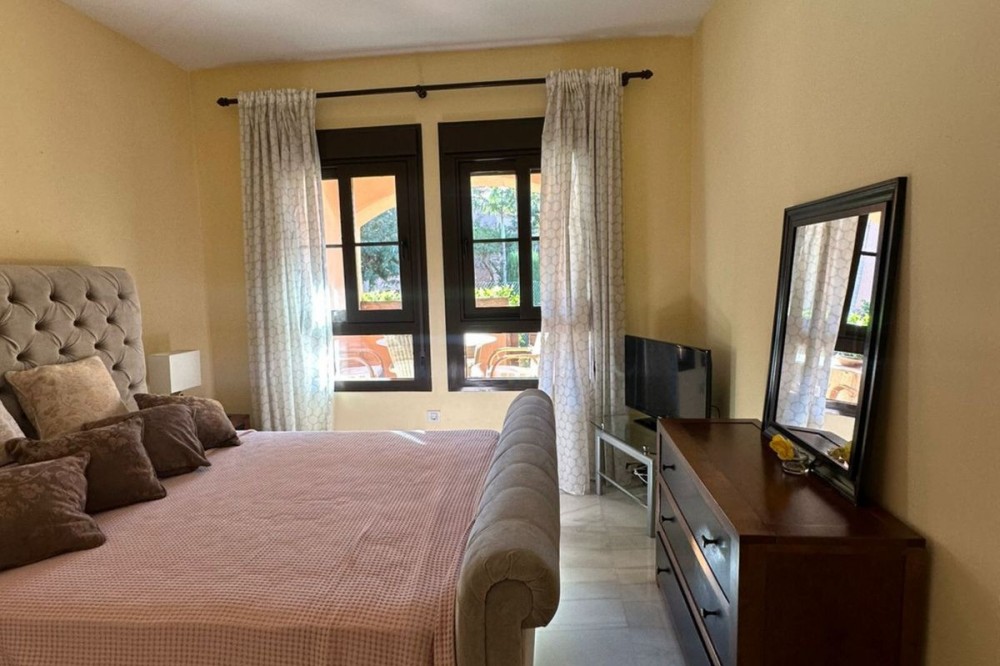 • Located in the gated community of Hacienda del Sol, this exceptional ground-floor apartment offers a rare opportunity to own one of the largest two-bedroom units in the complex. Just steps away from the beach in the desirable Atalaya area of Estepona, this property boasts spacious living areas and an enviable south-facing orientation. Situated directly across from one of the complex’s five pools, the apartment perfectly combines comfort and convenience. From the private terrace, you can enjoy serene outdoor living, with just a few steps—less than 10 meters—leading you to the pool. Inside, the apartment features a welcoming hallway, a spacious living room with a cozy fireplace, and a fully equipped kitchen with an adjoining laundry room. The master bedroom includes a complete en-suite bathroom with a bathtub, walk-in shower, and double sinks, as well as ample closet space and direct terrace access. A comfortable guest bedroom and a guest bathroom complete the layout. The property is sold fully furnished, including the added convenience of underground parking. Hacienda del Sol offers an unparalleled lifestyle, located just a two-minute walk from the beach and within walking distance of supermarkets and shops just outside the complex. A short drive takes you to San Pedro in five minutes and Puerto Banús in ten. The community itself is secure, with 24-hour gated security, and offers a wide range of amenities, including five pools, a gym, a tennis court, and the largest indoor jacuzzi on the Costa del Sol.