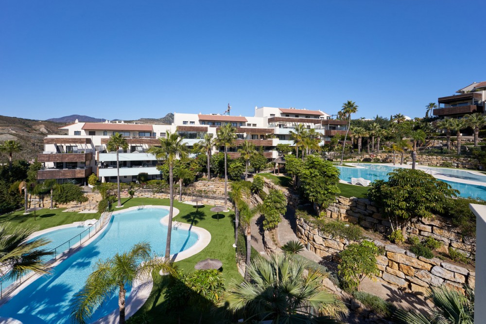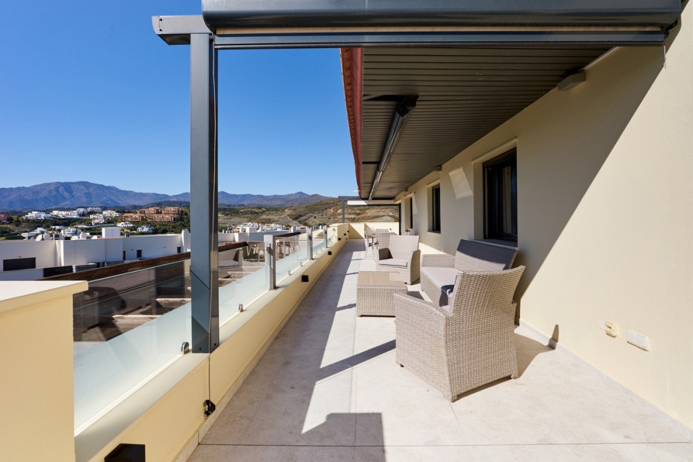 • Situated in the prestigious area Los Flamingos, Estepona East, Malaga. It has a spacious built area of ​​150 m² and an extensive terrace of 200 m². The penthouse has two spacious bedrooms and two bathrooms, providing privacy and comfort. The third bedroom has been converted into a dressing room. The fully fitted open plan kitchen has modern appliances that seamlessly connect with the living areas. The property is in excellent condition, reflecting the meticulous maintenance and attention to detail. The highlight of this penthouse is the outdoor living with its private terrace offering panoramic views of the sea, mountains, golf courses. Residents can also enjoy three communal swimming pools and a beautiful garden, as well as access to a tennis/paddle court, mini golf. The property is part of a gated community with a secure entrance, video intercom and lift, providing peace of mind and convenience. Additional features include electric blinds, double glazing, storage and fibre internet. Located close to golf courses, schools, restaurants and a 10 minute drive to the city centre, this penthouse combines tranquility and affordability. A private garage provides secure parking and pets are welcome, making it an ideal choice for families. Furniture is not included in the price. Don't hesitate to call us and visit this wonderful penthouse!