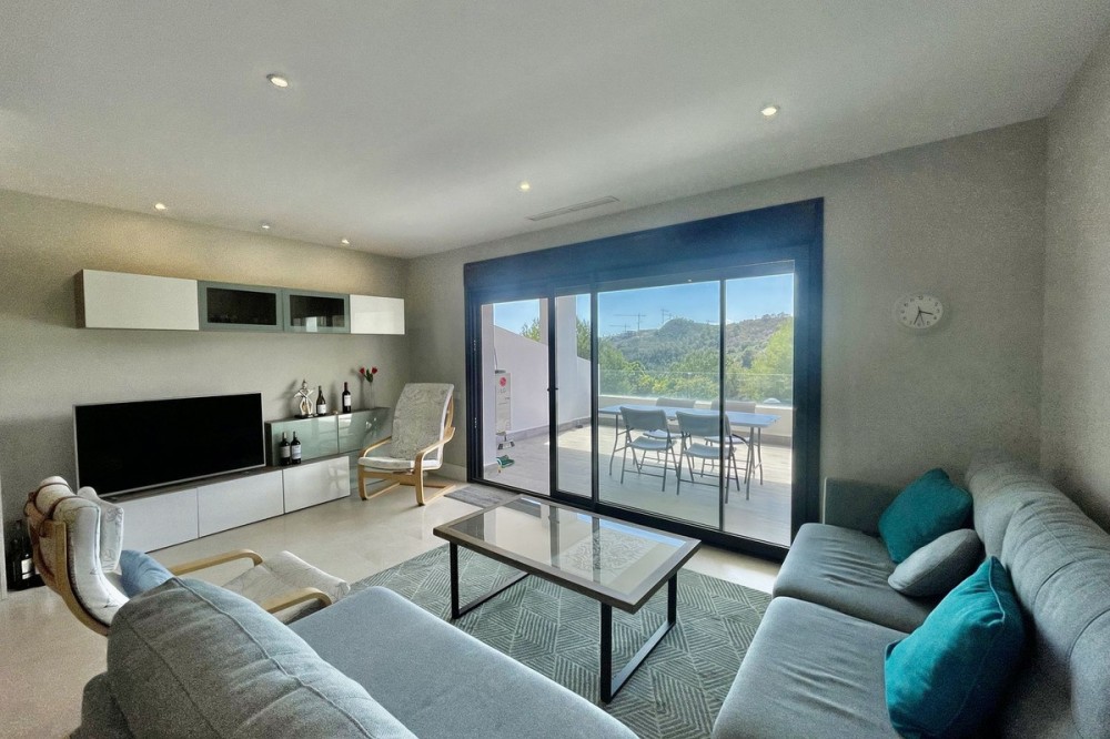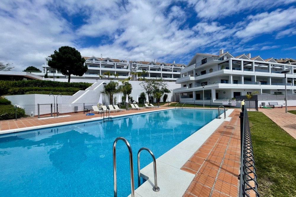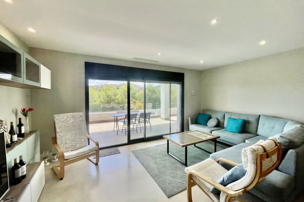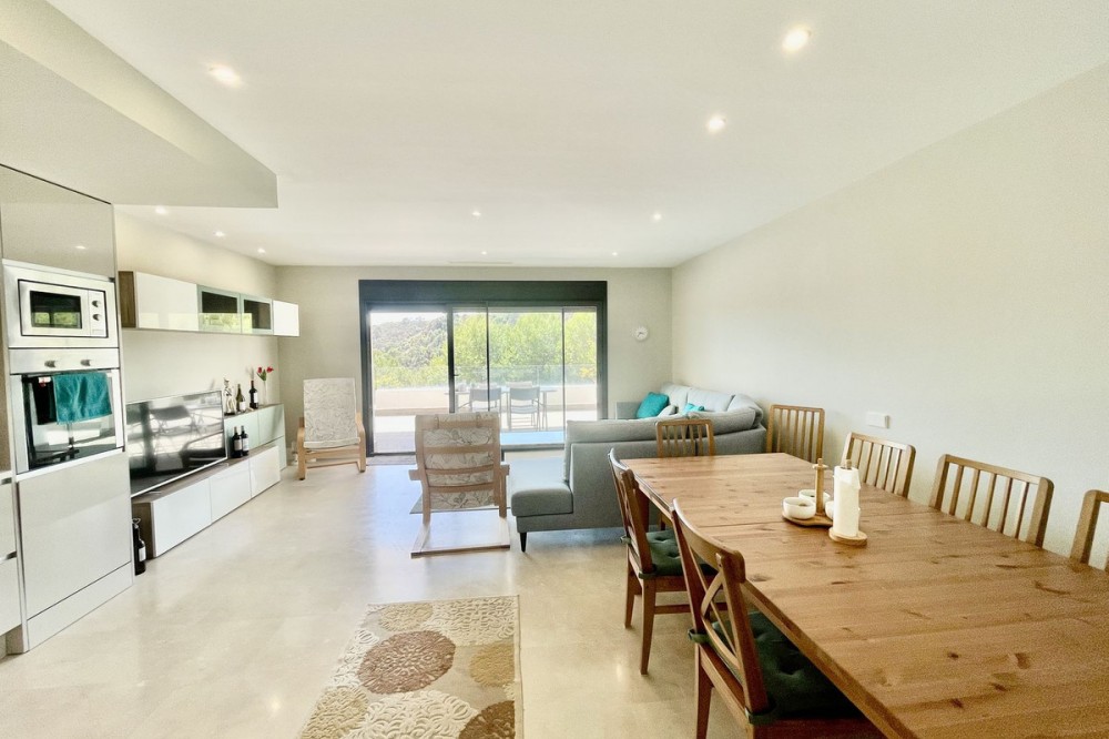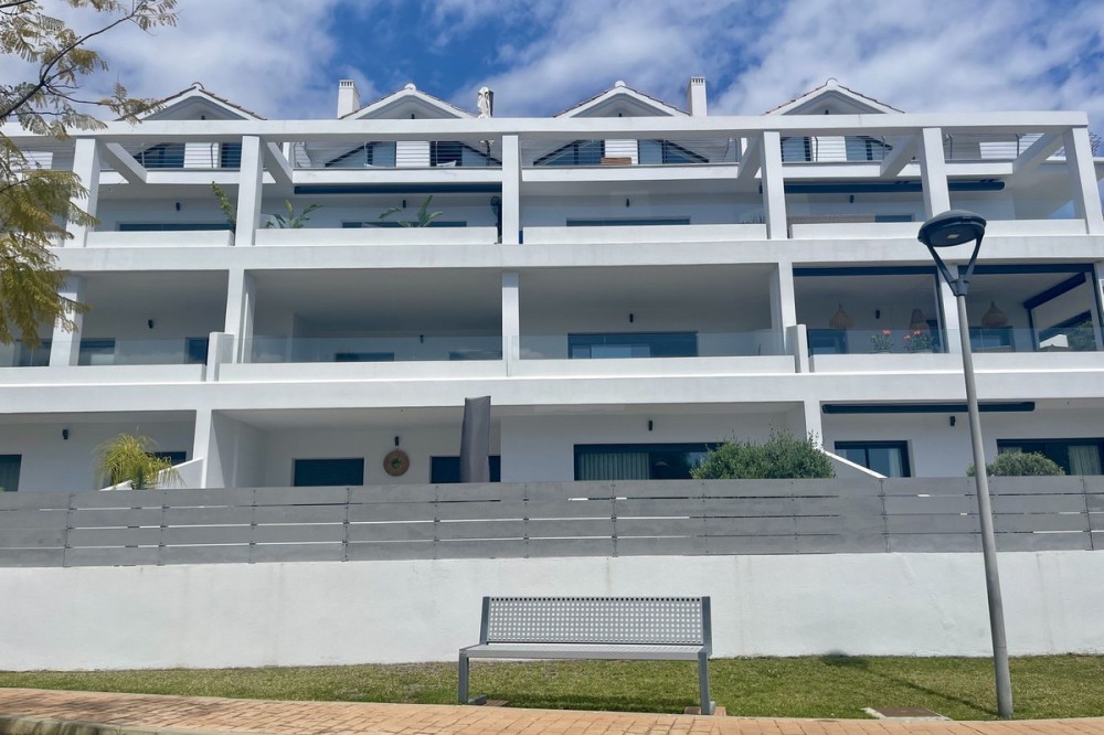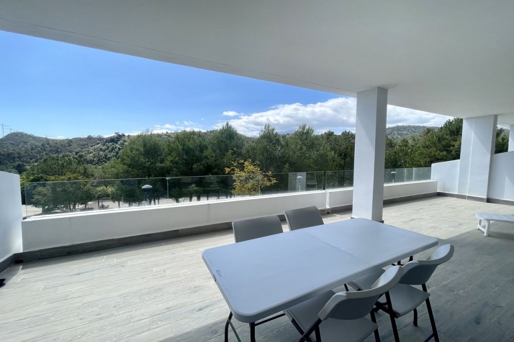 • This stylish two-bedroom, two-bathroom apartment is located on the first floor of the sought-after Ocean Hills complex in Selwo, Estepona. Completed in 2017, the property offers a generous 94 m² built area, with 80 m² of usable interior space, complemented by an impressive 51 m² terrace. The terrace, featuring both covered and open areas, is ideal for outdoor living year-round, with open green views creating a serene and private setting. There is also the option to enclose part of the terrace with Lumon glass curtains, adding a versatile space that can be enjoyed in all seasons. Inside, the apartment boasts a bright and airy layout with an open-plan living and dining area that flows seamlessly onto the terrace. Both bedrooms are spacious and enjoy direct access to the outdoor area, enhancing the indoor-outdoor lifestyle this home offers. The property is finished to a modern standard throughout, with two full bathrooms and a fully fitted kitchen with Bosch appliances and separate utility room. It is sold with a private parking space and a separate storage unit. Ocean Hills is a contemporary complex with beautifully maintained gardens and communal swimming pools, all set within a peaceful environment. Community fees are low, at just €180 per month, making this a fantastic opportunity as a permanent residence, holiday getaway, or investment.