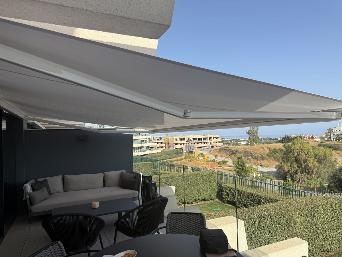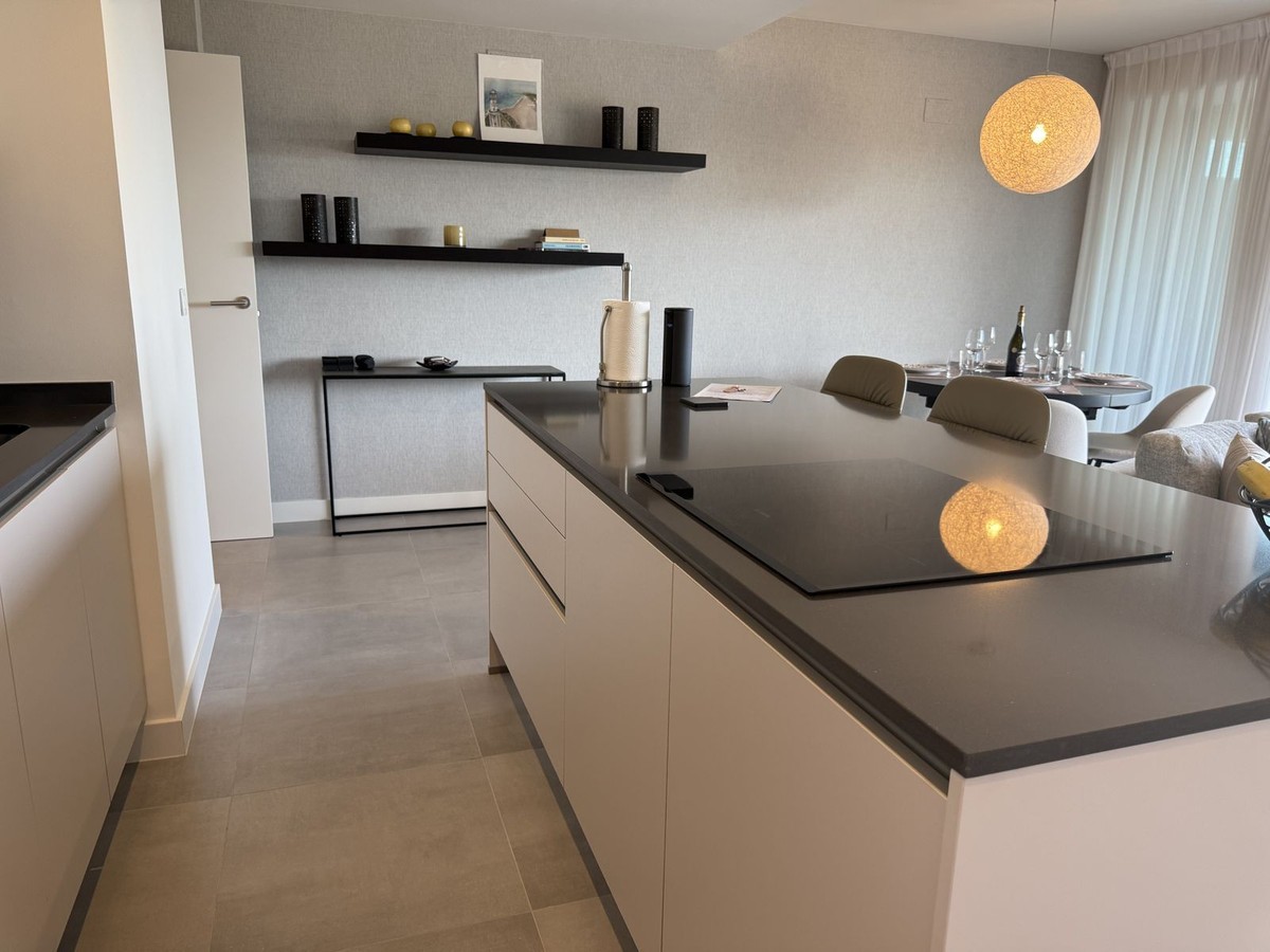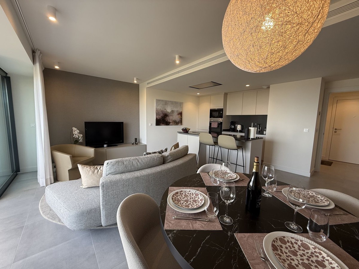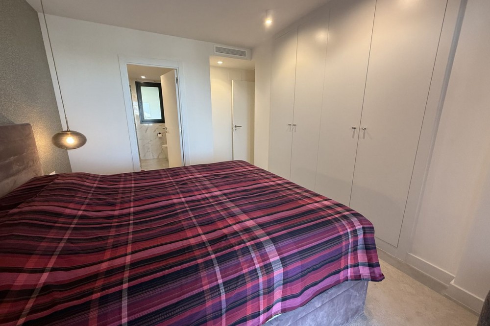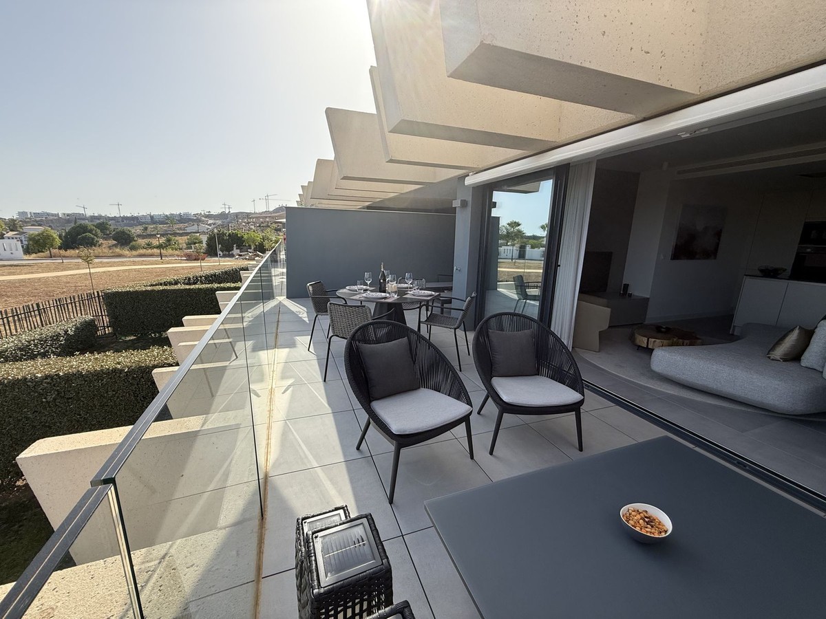 - Elegant 2-Bedroom Apartment with Sea Views in Oasis 325 – Turn-Key with (optional) Designer Furnishings On the gentle hills that follow the Guadalmansa River on its way to the sea lies Oasis 325 – a privileged residential enclave ideally located between Estepona and Marbella. Its elevated position offers breathtaking views over the Mediterranean and surrounding natural areas, creating a serene, private atmosphere just minutes from the best of the Costa del Sol. This beautifully appointed 2-bedroom apartment is situated on one of the best spots within the development, offering uninterrupted sea views, lush green surroundings, and exceptional peace. Delivered in 2021–2022 and maintained in impeccable condition, the property is presented fully furnished with refined designer pieces and is ready to move into – a true turn-key residence. The interior living space of 102 m² flows naturally into a spacious 28 m² terrace that faces southwest, ensuring sun from late morning until sunset. The layout includes an open-plan living and dining area with large sliding doors that open directly onto the terrace. The fully equipped kitchen is centered around a sleek island with integrated induction hob, combining elegance and functionality in a space designed for both cooking and socialising. The master bedroom offers direct access to the terrace and enjoys spectacular views of the sea – a rare and privileged feature. The second bedroom is also generously sized, and both bathrooms are equipped with walk-in showers and finished in a modern, minimalist style. Throughout the apartment, high-quality materials, tasteful decoration, and abundant natural light create an atmosphere of calm and understated luxury. The terrace itself is ideal for year-round enjoyment, featuring a cosy side corner that captures the lower winter sun and a smart, automatically retractable sun awning that adjusts based on wind strength. Thanks to a large protected green zone in front of the building, the views will remain unobstructed indefinitely, offering permanent visual space, silence, and privacy. As a resident of Oasis 325, you’ll enjoy access to a wide range of first-class facilities designed to promote wellness and relaxation. These include an outdoor infinity pool with separate children’s section, both surrounded by soft-touch synthetic grass, and a heated indoor pool with a beautiful cascade fountain. The wellness area features a sauna and Turkish bath, and the fully equipped gym includes separate male and female changing rooms, each with showers and private lockers. A modern co-working lounge completes the offering, ideal for remote professionals or digital nomads. The apartment comes with one underground parking space and a spacious private storage room in the basement, with more than enough space for electric bikes and additional storage needs. Additional features include energy-efficient hot and cold air conditioning, solar-assisted aerothermal water heating, double-glazed windows, and high thermal insulation, contributing to the property’s excellent A/B energy rating. This property represents a rare opportunity to enjoy modern Mediterranean living at its finest – combining panoramic sea views, timeless design, and full peace of mind in one of the most desirable developments on the Costa del Sol. Design furniture is not included in this price but possible at additional cost (30K)