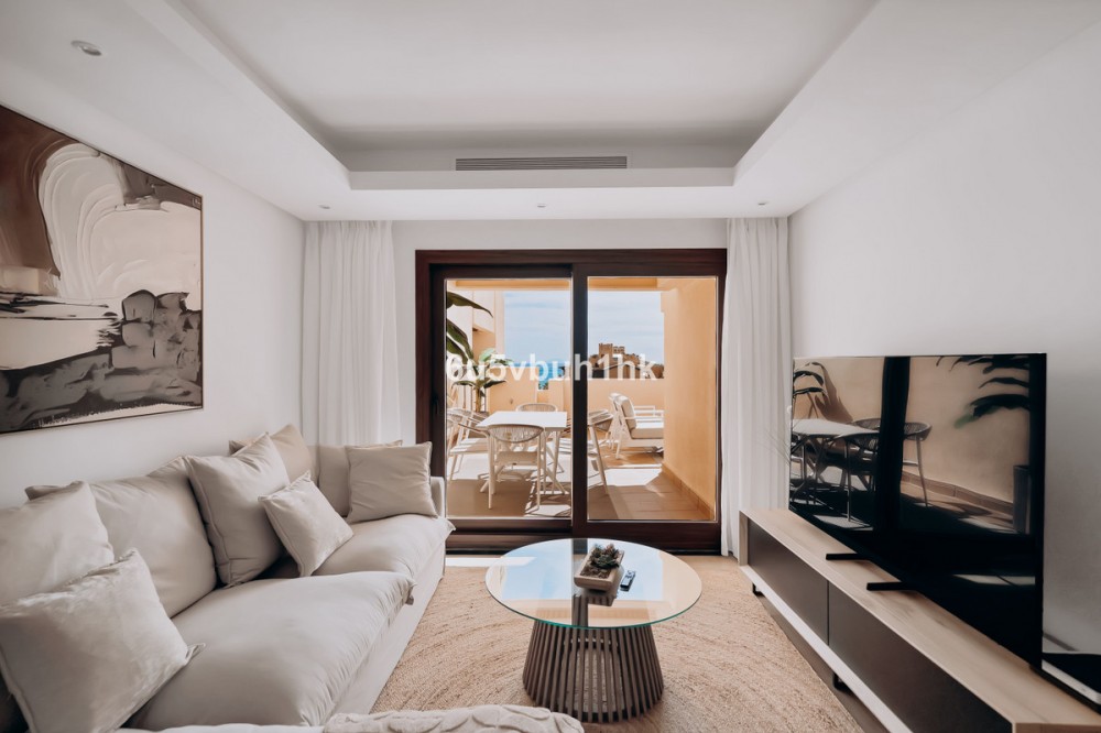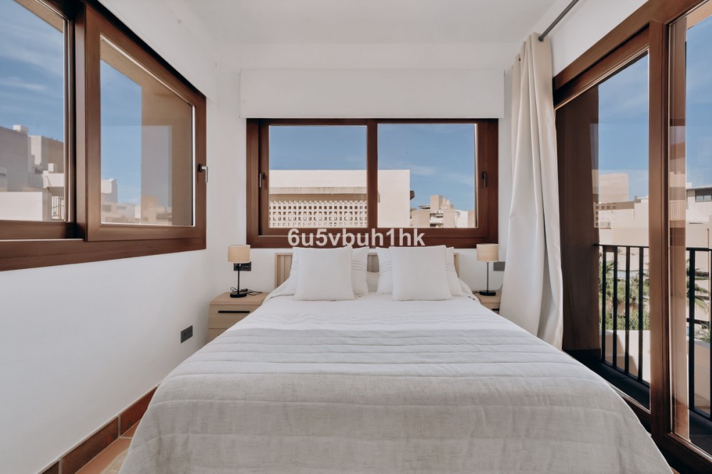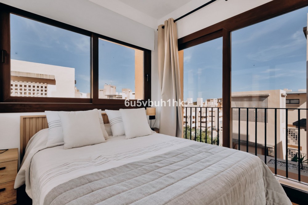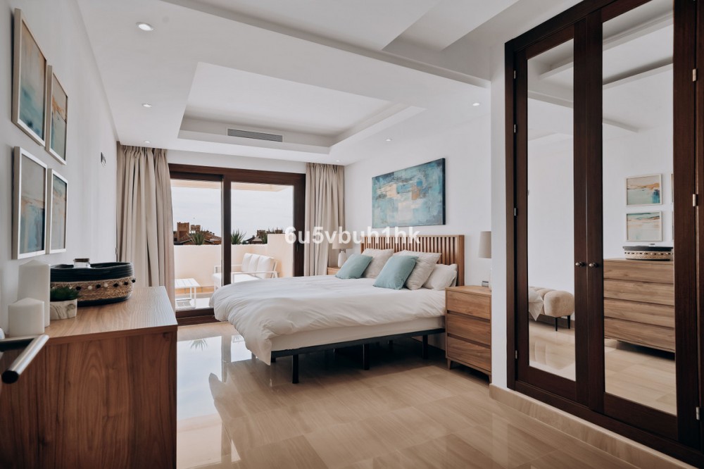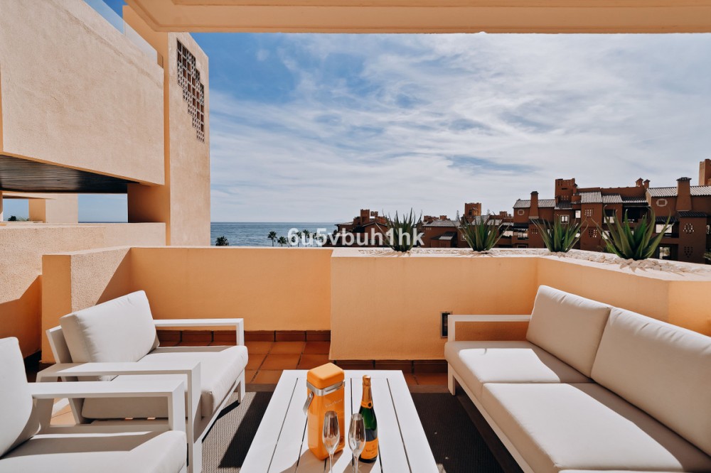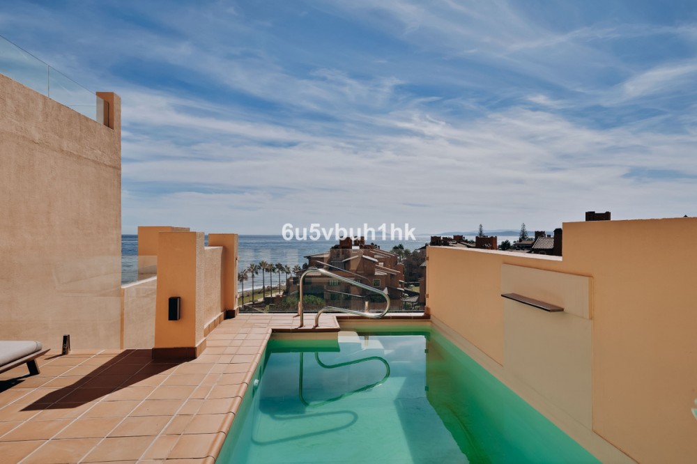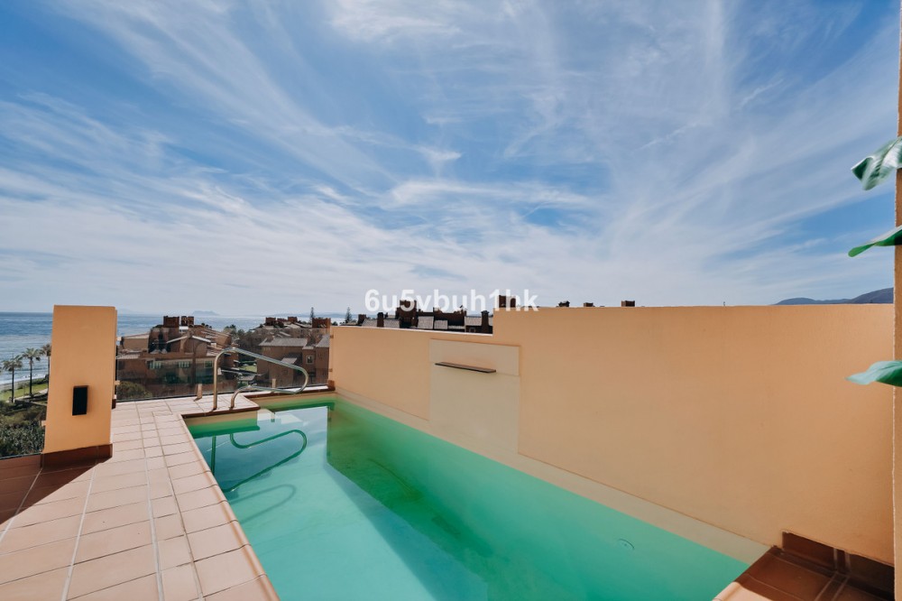 - Discover this spectacular 3-bedroom, 3-bathroom duplex penthouse, located in the prestigious Bahía de la Plata development, right on the beachfront in Estepona. A truly unique property that combines luxury, comfort, and an unbeatable setting with breathtaking views of the Mediterranean Sea and the Rock of Gibraltar. Fully renovated in a refined Nordic style, the residence offers bright open spaces, clean lines, and top-quality finishes, creating a sophisticated yet welcoming atmosphere—perfectly suited to the Mediterranean lifestyle. On the main floor, large windows connect the living-dining area with a private terrace, an ideal spot to unwind while enjoying the sea views. The modern, fully equipped kitchen blends seamlessly into the open-plan design, making it ideal for family life or entertaining guests. Each of the three en-suite bedrooms ensures privacy and comfort, with the master suite boasting direct access to the stunning panoramas. The property is in excellent condition, move-in ready, and designed for those seeking an exclusive residence or a perfect second home by the sea. The gated community of Bahía de la Plata provides 24-hour security, swimming pools, a gym, spa facilities, and direct beach access—making this a unique opportunity for buyers who value quality, location, and exclusivity.