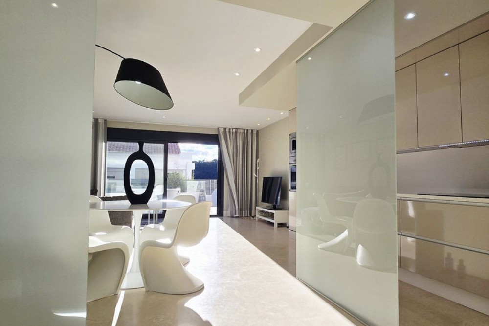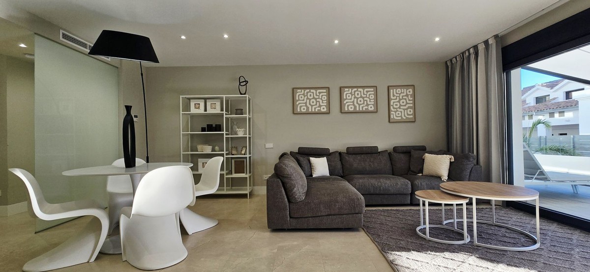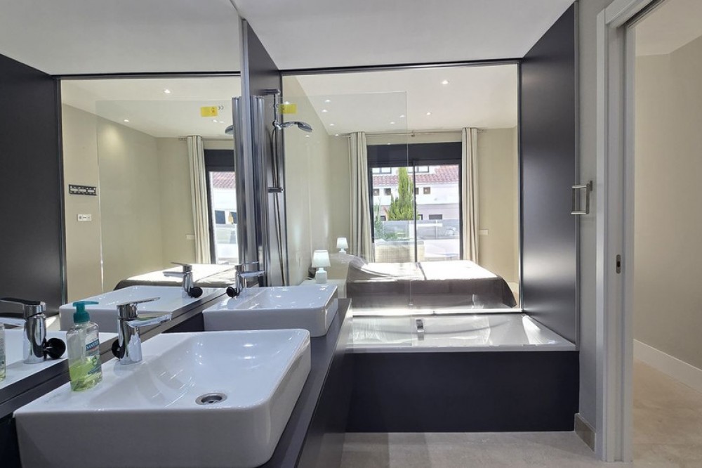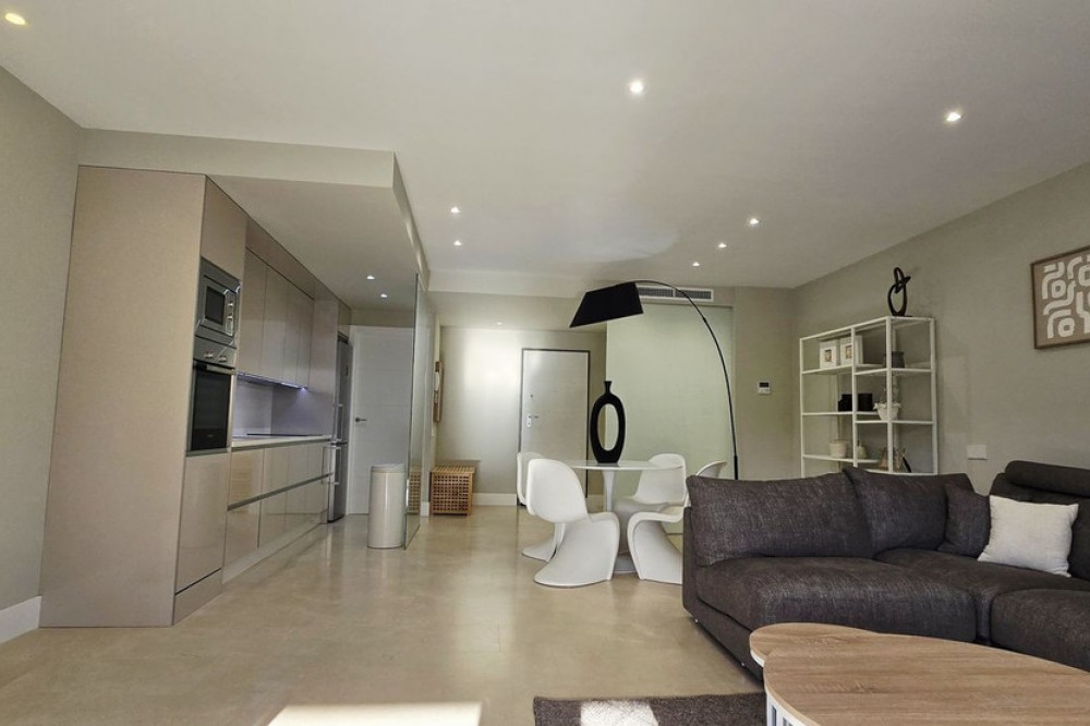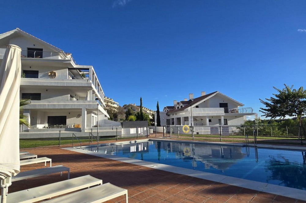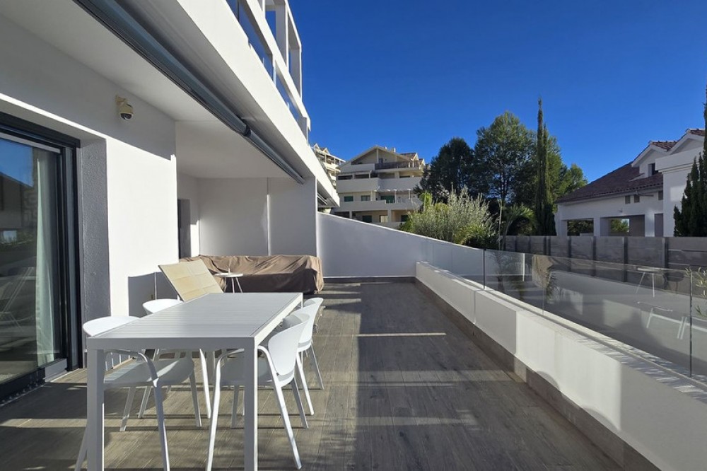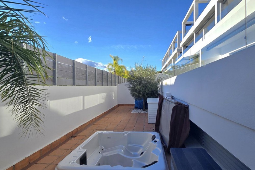 • Estepona – New Golden Mile Discover a unique opportunity to own a bright, spacious, and modern apartment with a large private terrace offering stunning mountain views. This stylish property is in excellent condition. Upon entering, you’ll immediately appreciate the sense of space created by the open-plan layout, featuring a contemporary American-style kitchen and a generous living area that seamlessly connects to the expansive terrace — the perfect place to enjoy the Costa del Sol’s wonderful climate. The terrace is set on two levels: the lower level features a private jacuzzi, ideal for relaxing in privacy. Both bedrooms have direct access to the terrace, filling the rooms with natural light. The guest bedroom includes fitted wardrobes, while the primary suite boasts a walk-in wardrobe and a spacious ensuite bathroom with double sinks and a bathtub. There is also a modern guest bathroom with a walk-in shower. The property includes two private parking spaces and a storage room. Built in 2016, Ocean Hills offers excellent communal facilities, including two swimming pools (one for children), a gym, and underground parking. The location is ideal — just 5 minutes from Atlas International School, 3 minutes from La Resina Golf Course, and less than 10 minutes from the beach and local supermarkets. Estepona town centre and Puerto Banús are only a 12–15 minute drive away. Additional features: Electric blinds Electric awnings 2 parking spaces Storage room