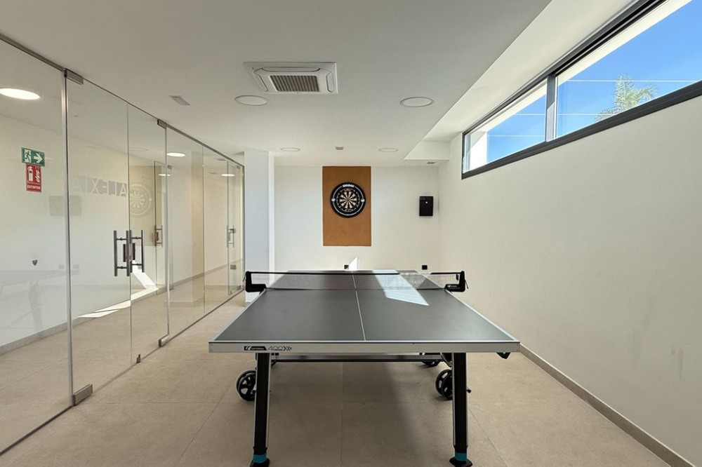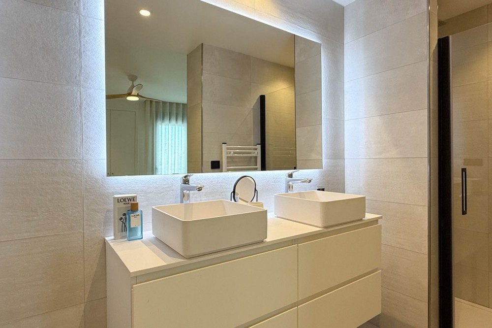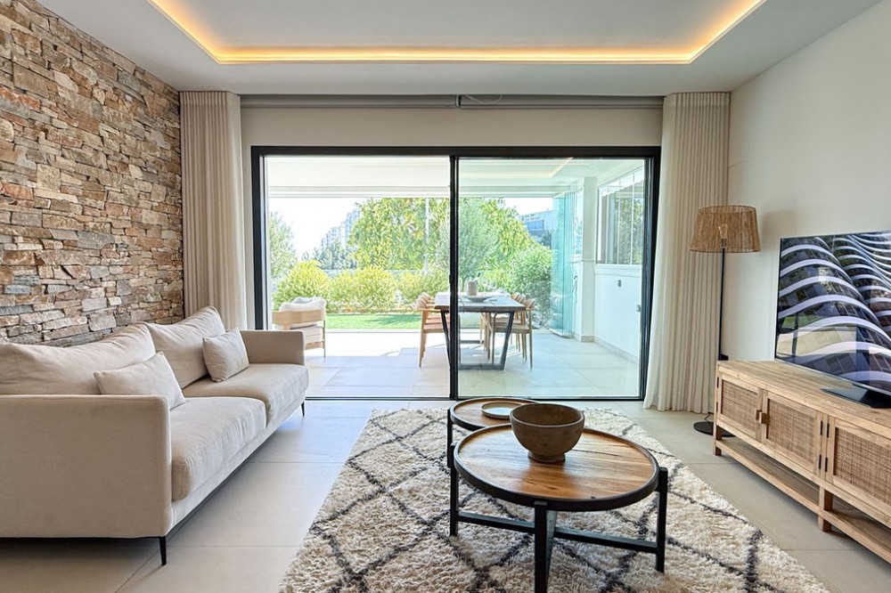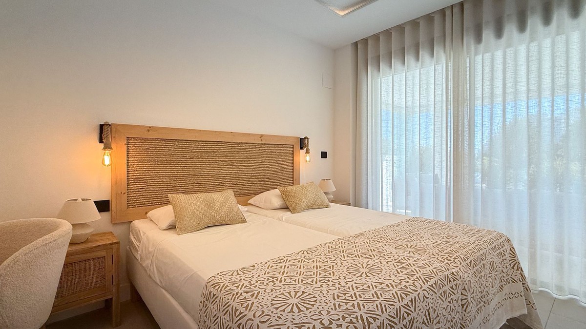 • Fantastic luxury apartment located in the centre of Estepona, the garden of the Costa del Sol. This newly build apartment is conveniently situated within walking distance of the marina of Estepona , close to the romantic and vibrant old town and only 15 minutes walk from the beach of La Rada. Offering 2 bedrooms and 2 bathrooms. The main bedroom has an open plan bathroom with walk-in shower, anti-fog mirrors, electric towel racks and extra wardrobes. A fully equipped and open plan kitchen with all Bosch appliances and spacious living dining area. Carefully decorated in a perfect blend of Scandinavian minimalism, boho accents and ethnic touches. But more than that, it is the ideal place for outdoor living as there is also an oversized covered terrace that has been recently upgraded with glass curtains for maximum use of the terrace all year round and a very nice mediterranean garden with very low maintenance. The terrace has water and electricity pre-installation for an outdoor kitchen. The garden has sprinkler installation for automatic watering of the plants as wel as pre-installation for a jacuzzi. The domotic system for home automation is also installed to control the lights and electric blinds. Air conditioning and floor heating are provided though aerothermal energy. Also good to know is that the extra spacious utility room with washing machine and tumble dryer is just across the front door. A private underground parking space is also included in the price. The exclusive gated community offers a large outdoor pool and state of the art gym facilities, community area, game room and secure entrance. Alexia Life stands out for its architecture and design but also for the great community and is a must see if you are looking for the perfect holiday house or for all year round living.