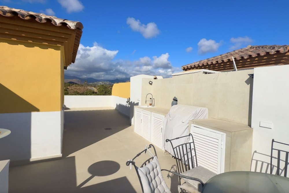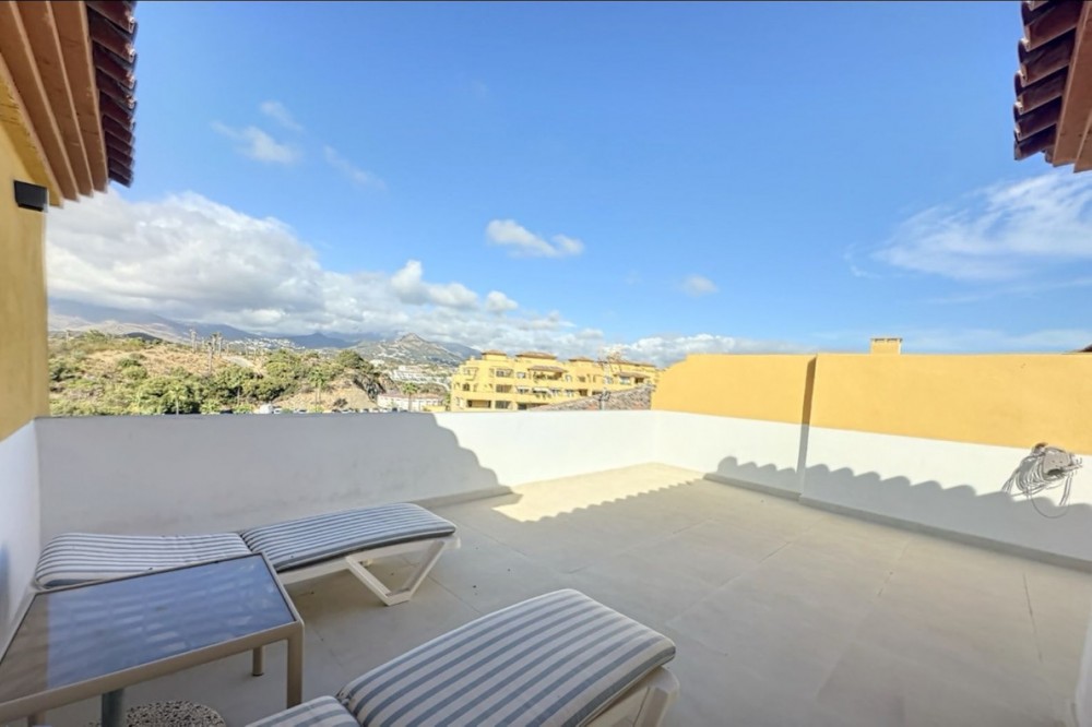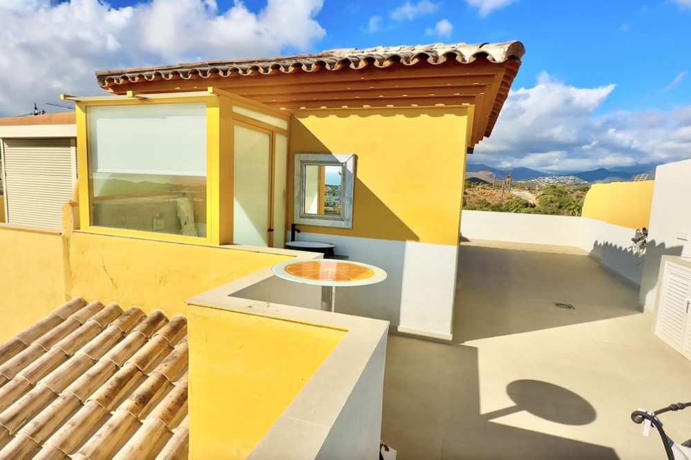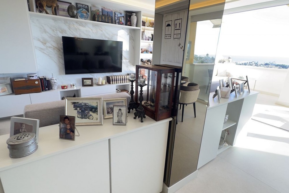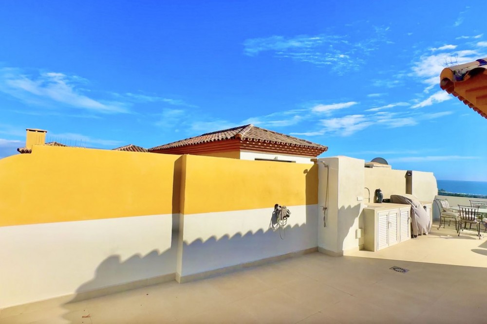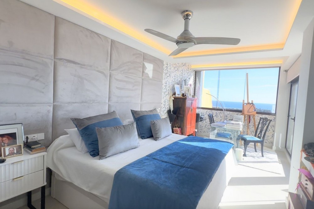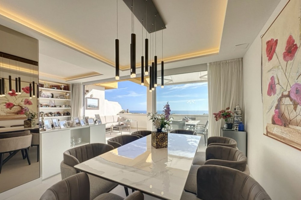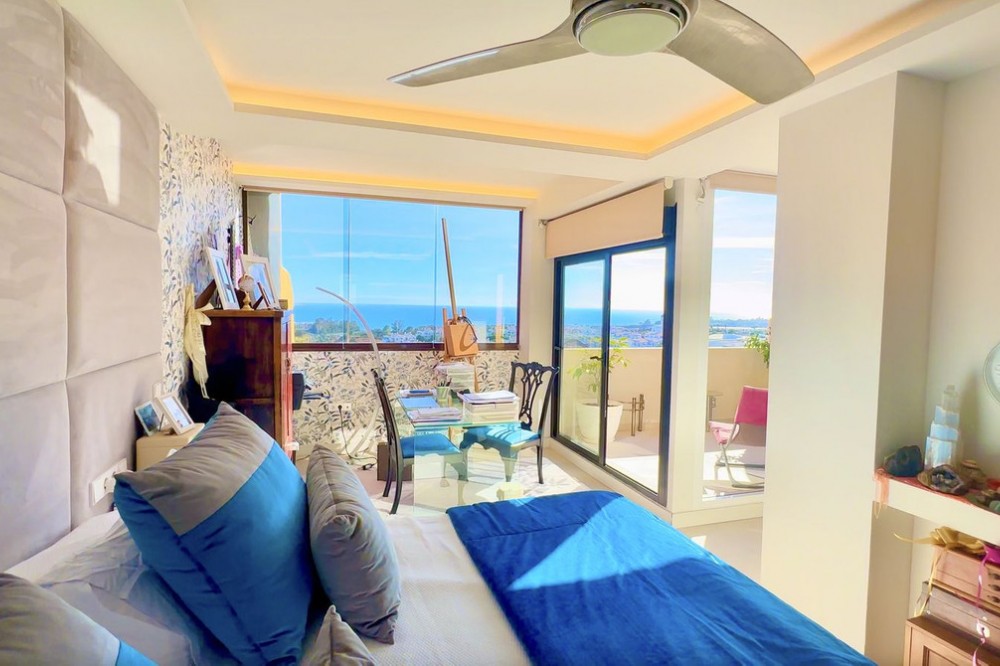 • This exceptional triplex penthouse stands out as one of the most unique and meticulously designed properties in the Selwo area of Estepona. Its current owners, **renowned interior designers**, carried out a complete **bespoke, full-scale renovation**, originally conceived for their own personal use. This is reflected in the selection of top-quality materials, custom finishes, contemporary aesthetics, and an exceptional attention to detail throughout the residence. Distributed across **three floors**, the property can be accessed either via wide, elegant, and ergonomic internal stairs or through a **private lift inside the home**—a rare luxury even among high-end properties. Located in a gated community surrounded by nature, the penthouse occupies a privileged elevated position offering **uninterrupted panoramic views of the Mediterranean Sea**—and on clear days, the vistas extend breathtakingly all the way to the **African coastline**, making every sunrise and sunset truly spectacular. **Interiors Designed with Precision and Modern Technology** The home showcases a completely redesigned interior with clean lines, natural textures, and expertly planned lighting. The entire property features **integrated LED lighting in walls and ceilings**, creating warm, sophisticated ambiances that enhance every space. All three bedrooms are spacious and filled with natural light, and each is equipped with **electric shutters**, providing comfort, privacy, and full control over brightness. Two of the bedrooms include beautifully redesigned **en-suite bathrooms**. The master suite features a generous spa-style bathroom, a custom-made **walk-in closet**, and an elegant **coworking area**, ideal for working from home with complete tranquility. The fully equipped kitchen, fitted with high-end integrated appliances, opens onto the contemporary open-plan living and dining area. This space flows seamlessly to the main terrace, maximizing the sense of openness. Additionally, the property includes an advanced **water filtration and softening system**, ensuring high-quality water throughout the entire home. **Terraces & Outdoor Spaces That Elevate the Living Experience** The **main terrace**, spacious and perfectly south-facing, features a **large electric parasol**, allowing you to adjust the shade effortlessly. It is ideal for enjoying breakfast with sea views or dining outdoors while taking advantage of the Costa del Sol’s exceptional climate. On the top floor, the property reveals a stunning **private solarium**, a true oasis designed for relaxation and entertainment. This extraordinary space includes: * A **chill-out area** with custom outdoor furniture * A zone created specifically for **special star-lit nights** * A beautifully integrated **barbecue area** * Breathtaking views over the Mediterranean and the mountains This solarium transforms the upper floor into the perfect retreat for gatherings with friends, intimate celebrations, or simply unwinding under the sun or stars. **Community & Surroundings** The gated residential community offers landscaped gardens, several swimming pools for adults and children, security, and a peaceful atmosphere surrounded by nature—while still being close to essential services, beaches, and main transport connections. The property includes **a private parking space**, and an additional **second private parking space**, adding substantial value and convenience.