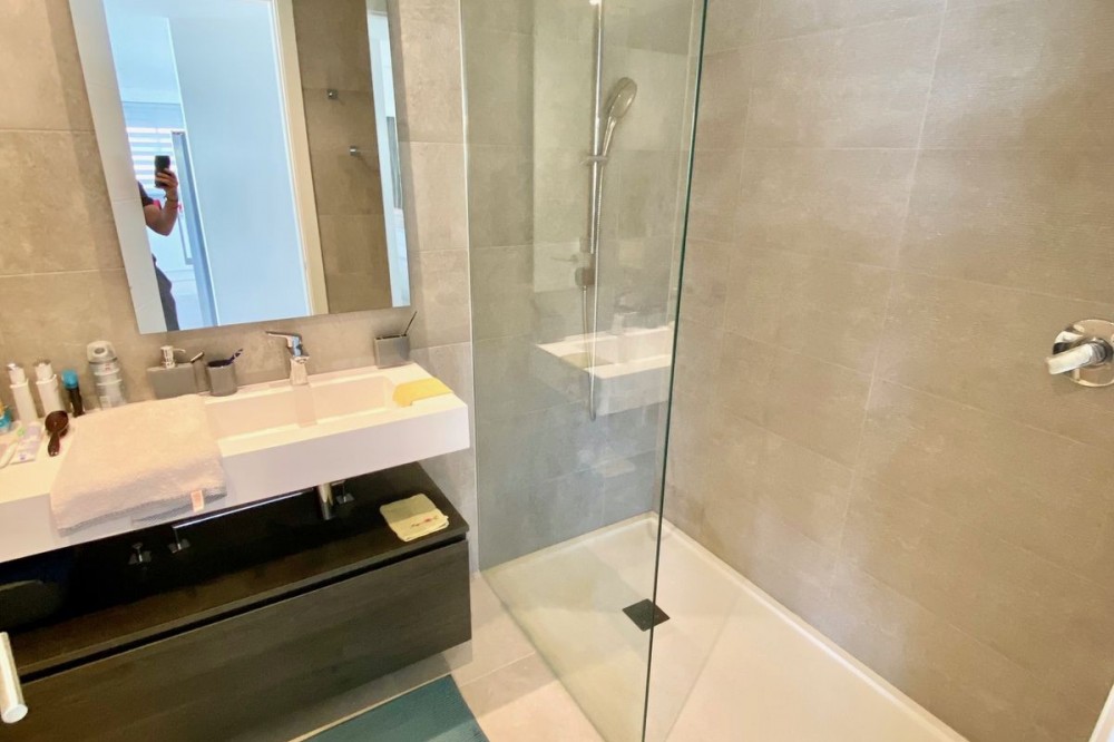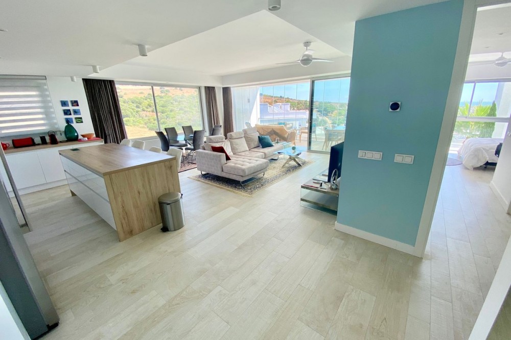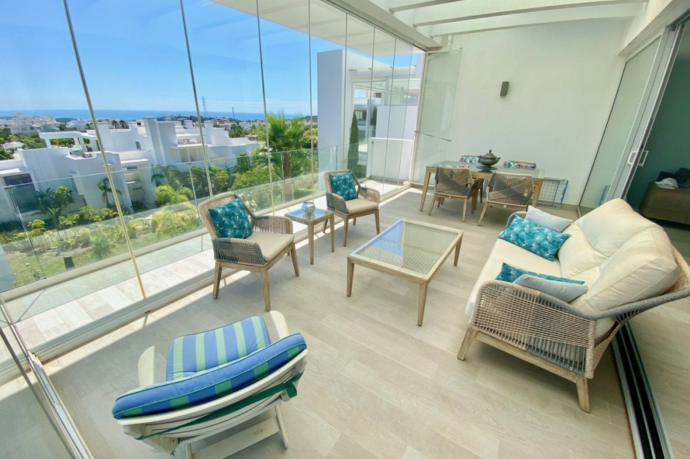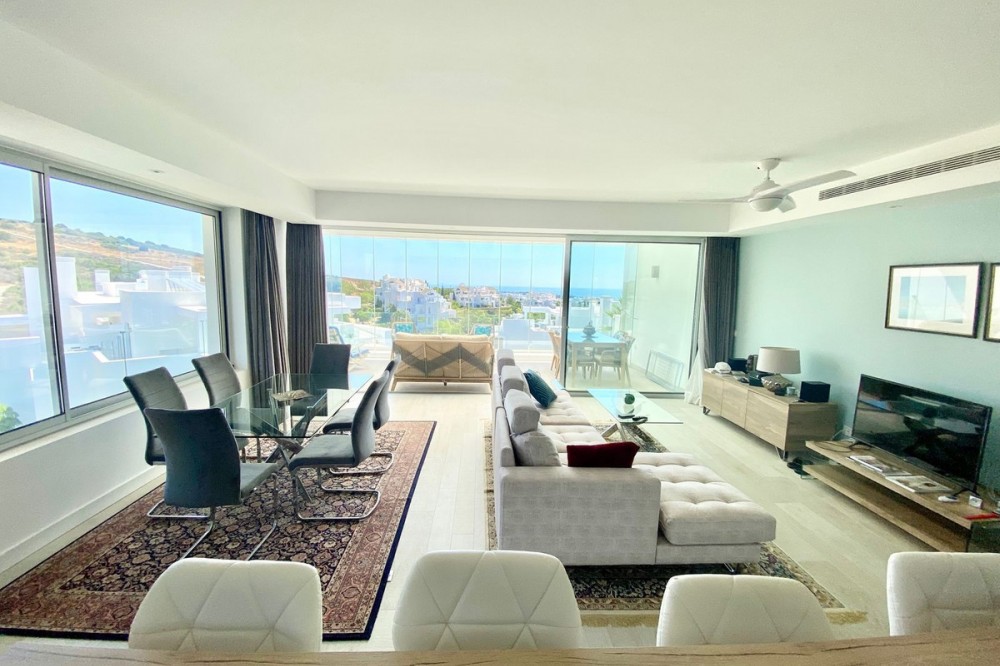 • Love at first sight! Large 3 bedroom corner unit in a paradise environment, yet 5mn to all amenities/golf/sea, and the town of Estepona. Situated in the most elevated and private bloc, phase 3 of Alcazaba Lagoon, your senses awaken as you enter, thanks to the wonderful light and layout. The urbanisation is state-of-the-art, with all the amenities you can think of: a private laguna where owners can do all kind of water sports, or relax in one of the white sand beaches; a mediterranean restaurant and a beach bar; a gym and mini market; jacuzzi and sauna; and of course swimming pools, a massive garden, and hiking trails. The size of the living room is really spectacular, and the extensive fully-equipped open kitchen blends in perfectly. The 44m2 wrap around terrace has open views towards the sea and garden on one side, and to the Estepona mountains and a protected agricultural land on the other. The owner has installed glass curtains to create a chill-out area, which can be opened or closed. The sleeping area consists of 3 wide bedrooms (one has been converted to an office), and 2 full size bathrooms. The owner has just finished a substantial renovation and refurbishment, including a brand new kitchen, ventilators, terrace, furniture, custom-made curtains ... Ready to move into. The price comes with two underground private parking spots, and a huge fitted storage room. A must see!!