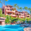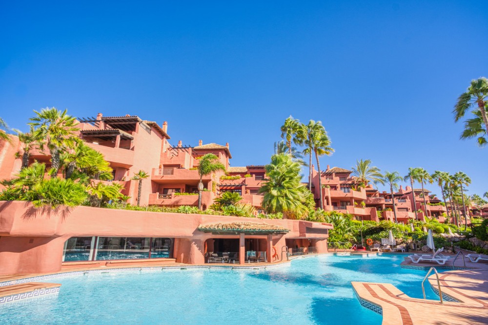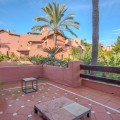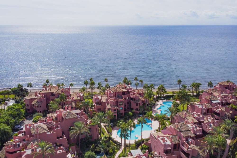 - Impressive three bedroom south facing duplex penthouse in the prestigious and gated beachfront community Menara Beach, Estepona. This sought-after complex has well-kept tropical gardens, outdoor communal swimming pool, indoor heated swimming pool and gymnasium, as well as being just ten minutes’ drive to Puerto Banus and a short drive to shops, restaurants and all amenities. The property has an open plan living and dining area with patio doors leading to two private terraces with beautiful sea views; fully fitted kitchen with separate laundry area; guest suite with access to the terrace; guest bedroom; and a guest bathroom. The upper-level leads to the impressive master suite with vaulted ceilings and a private terrace; on this level there is an additional large terrace with BBQ area and stunning views of the community and sea. Other features include fitted wardrobes throughout, marble floors, hot and cold air conditioning, underfloor heating in the bathrooms, private parking and store room.