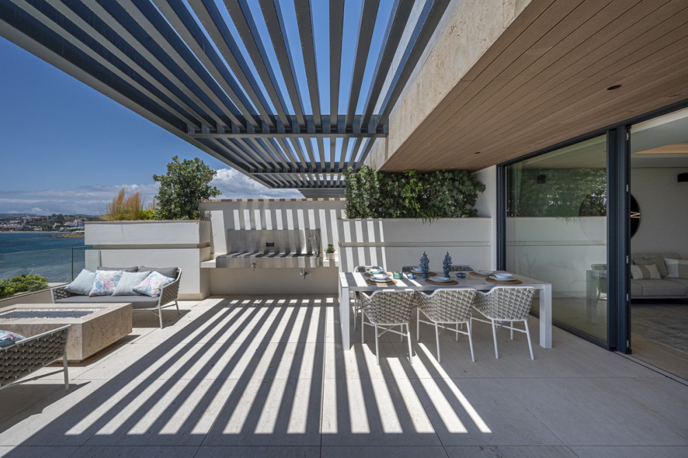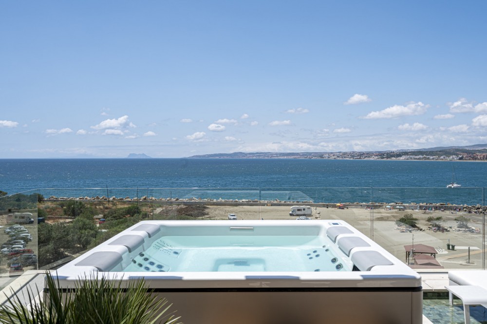 - Located in the highly sought-after Playa del Cristo area of Seghers, Estepona, this luxurious beachfront apartment epitomises modern living with a touch of coastal elegance. Offering uninterrupted panoramic sea views, this newly constructed property, completed in 2024, combines prime location with state-of-the-art amenities, making it an exceptional opportunity for discerning buyers. Spanning an impressive 120m² of interior space, the apartment features two generously proportioned bedrooms and two meticulously designed bathrooms. The fully fitted kitchen, equipped with high-end appliances, flows seamlessly into the open-plan dining and living areas, creating a perfect space for entertaining or relaxation. Premium finishes, including marble flooring, double glazing, and glass doors, enhance the sophisticated aesthetic, while the home automation system, central heating, and air conditioning ensure year-round comfort. Additional highlights include a utility room, storage room, and 2 private garage spaces The expansive 120m² terrace with outdoor kitchen, hot tub, is a standout feature, offering both covered and uncovered areas to enjoy the Mediterranean climate. Residents can indulge in a private pool, a jacuzzi, and a sauna, all complemented by access to a communal indoor pool and a fully equipped gym. The gated community provides 24-hour security with surveillance cameras and video entrance systems, ensuring peace of mind. Modern conveniences such as domotic home intelligence, electric blinds, fibre-optic internet, satellite TV, and fitted wardrobes further enhance the living experience. Situated within walking distance of Estepona Old Town and close to renowned restaurants, shops, and schools, the property offers direct access to the beach and proximity to golf courses and children’s playgrounds. The vibrant marina and cultural landmarks of Estepona are just moments away, while excellent transport links make exploring the Costa del Sol effortless. This apartment is ideal for those seeking a luxurious coastal lifestyle or a sound investment in a prime beachfront location. Schedule a private viewing today to fully appreciate all this exceptional property has to offer. The price includes all furniture and fittings