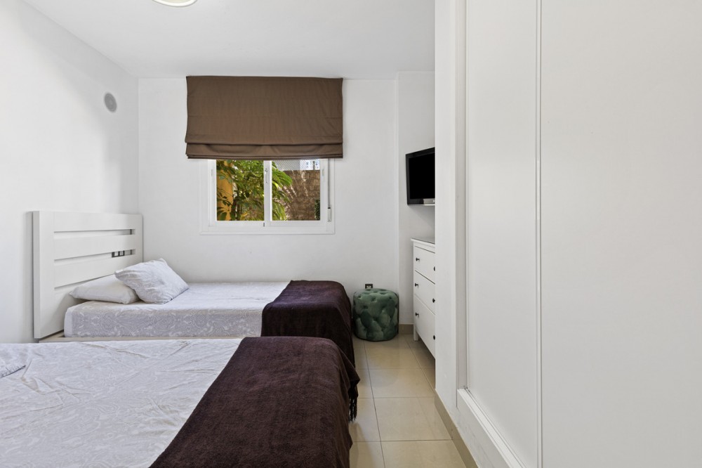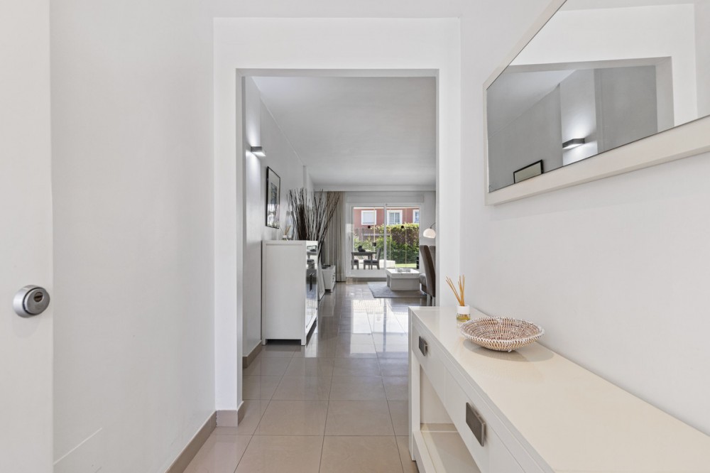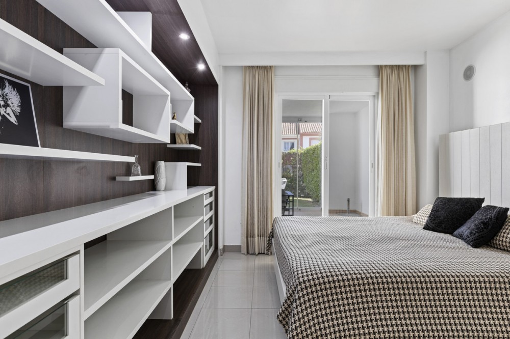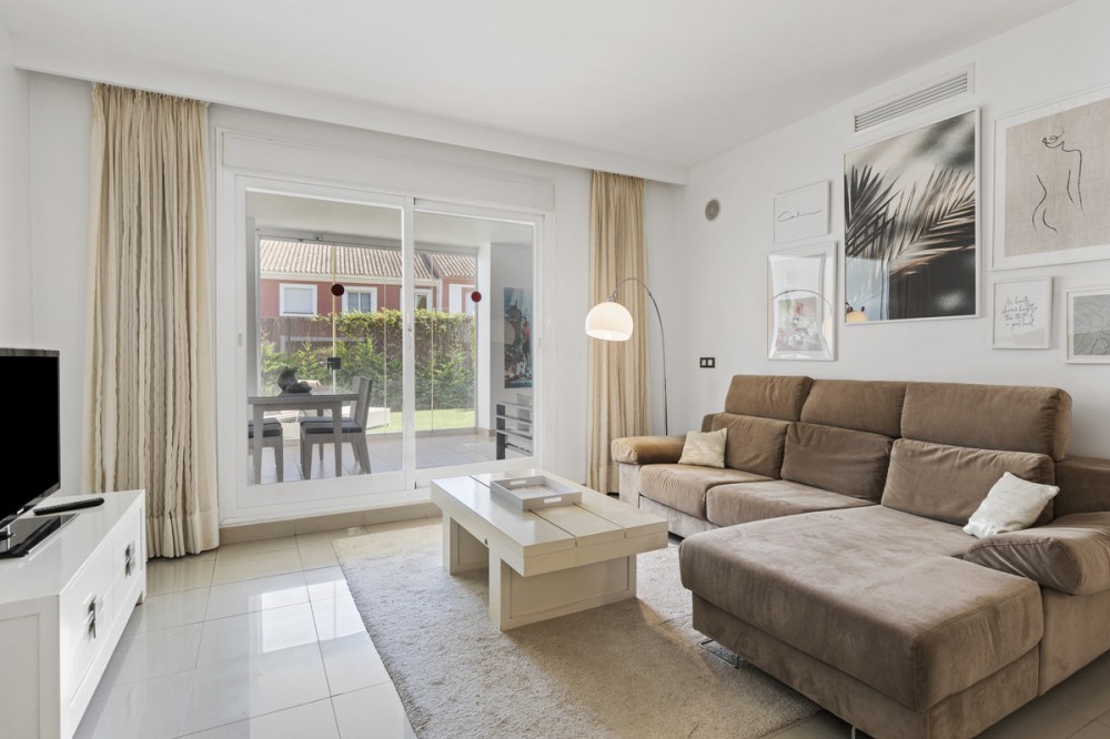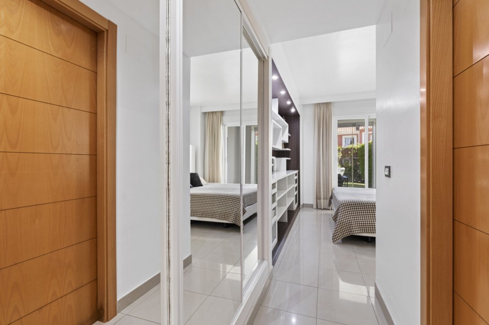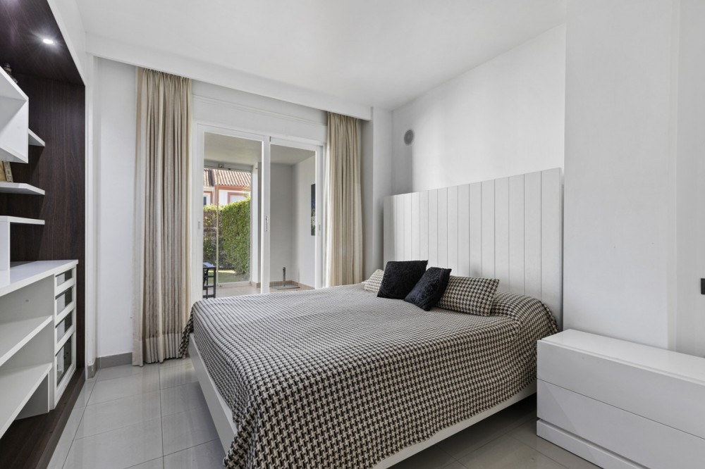 • Luxury two-bedroom apartment featuring a spacious living/dining room, fully equipped kitchen with separate utility area, and two bedrooms — one with an en-suite bathroom, the other with a family bathroom. Both bedrooms include built-in wardrobes. A highlight of the property is the large covered terrace with glass curtains, that leads out onto a wonderful private garden. This versatile space comfortably accommodates both seating and dining areas, making it a perfect second living space during the cooler months. This ground-floor apartment combines the generous dimensions of one of the larger units in the complex with the convenience of stair-free access, enhancing overall accessibility. Residents and guests can enjoy the beautiful Spanish climate in the impressive communal swimming pools, set within landscaped tropical gardens complete with sun-beds and a stylish beach bar. The resort offers 24-hour security, stunning communal areas, and a serviced *chiringuito* with a bar and restaurant at the heart of the development. Cortijo del Mar is within easy walking distance of local shops, restaurants, and the nearby clubhouse, which features an indoor pool, gym, tennis courts, golf course, and kids' club.
