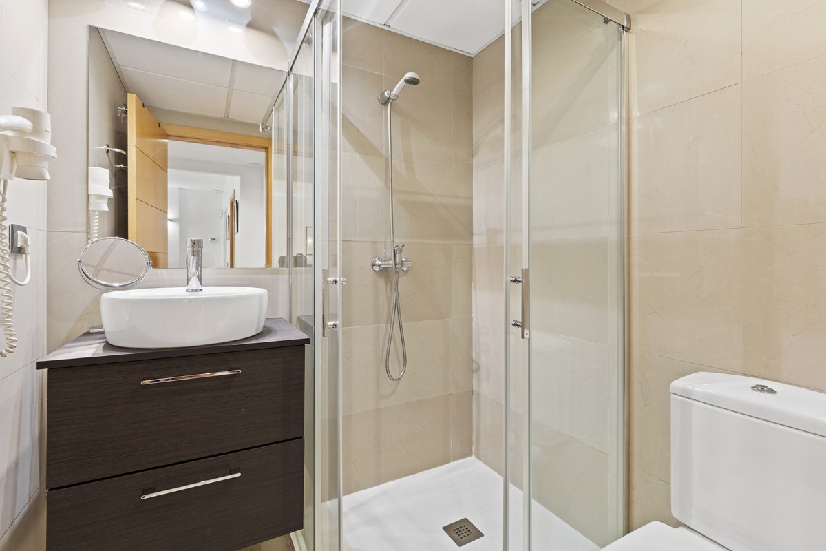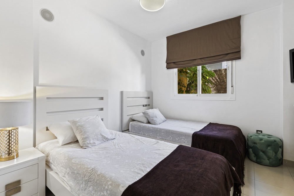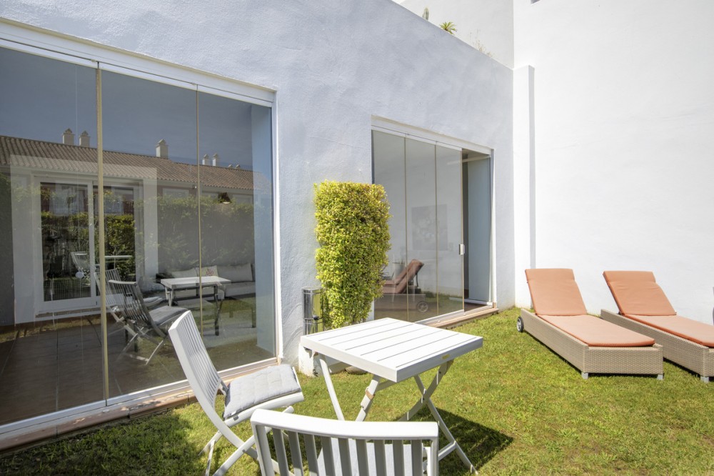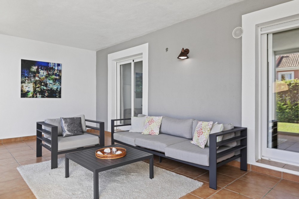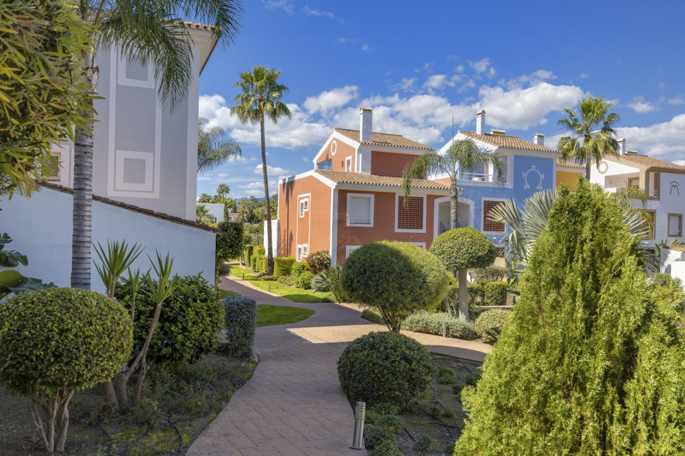 • Luxury two-bedroom apartment featuring a spacious living/dining room, fully equipped kitchen with separate utility area, and two bedrooms — one with an en-suite bathroom, the other with a family bathroom. Both bedrooms include built-in wardrobes. A highlight of the property is the large covered terrace with glass curtains, that leads out onto a wonderful private garden. This versatile space comfortably accommodates both seating and dining areas, making it a perfect second living space during the cooler months. This ground-floor apartment combines the generous dimensions of one of the larger units in the complex with the convenience of stair-free access, enhancing overall accessibility. Residents and guests can enjoy the beautiful Spanish climate in the impressive communal swimming pools, set within landscaped tropical gardens complete with sun-beds and a stylish beach bar. The resort offers 24-hour security, stunning communal areas, and a serviced *chiringuito* with a bar and restaurant at the heart of the development. Cortijo del Mar is within easy walking distance of local shops, restaurants, and the nearby clubhouse, which features an indoor pool, gym, tennis courts, golf course, and kids' club.