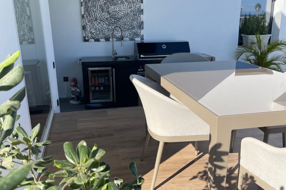 - Exclusive Penthouse in Mirador de Estepona Hills with Unmatched Panoramic Views Introducing a truly spectacular penthouse in the prestigious Mirador de Estepona Hills residential complex. Perfectly oriented to the southwest, this home offers breathtaking 360-degree views of the Mediterranean Sea, Gibraltar, the African coastline, and Marbella’s iconic skyline. Originally designed with three bedrooms and two bathrooms, the property has been meticulously transformed to create a contemporary and versatile layout, featuring approximately 200 m² of interior living space and 200 m² of surrounding terraces. Upon entering, you are welcomed into an elegant open-plan concept: • A spacious designer kitchen to the right combines style and functionality. • To the left, a walk-in dressing room provides convenience and storage. • Behind the kitchen, a generous utility/storage room offers additional flexibility. From the kitchen, you step into a large office space that flows seamlessly onto a private terrace, perfect for installing a jacuzzi or plunge pool, with unparalleled views of Sierra Bermeja. To the left, a bright dining area enclosed with glass curtains invites natural light and panoramic views, providing access to one of the most impressive wrap-around terraces on the Costa del Sol – a perfect setting for year-round outdoor living. The sleeping area, located straight ahead from the entrance, comprises two bedrooms and two bathrooms, including a master suite with its own en-suite bathroom. Additional features include two private parking spaces, two storage rooms, and direct lift access to the penthouse, ensuring absolute privacy and exclusivity. A unique home where luxury meets tranquility – the perfect retreat in the heart of the Costa del Sol.