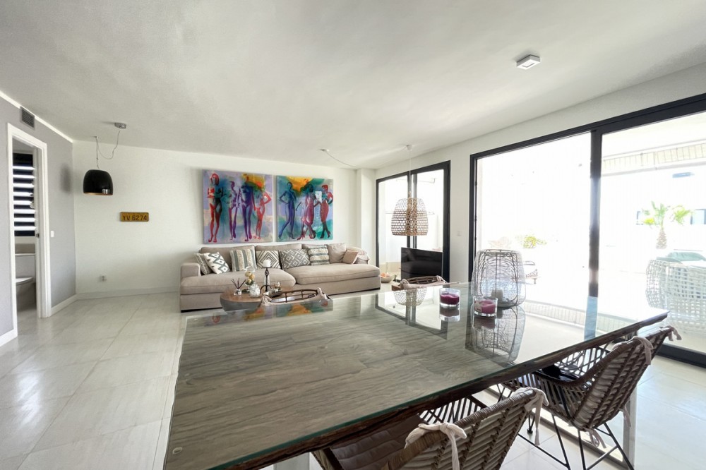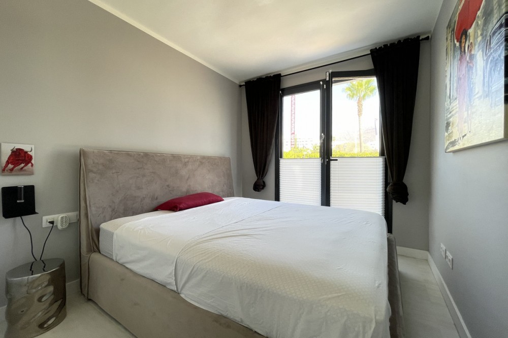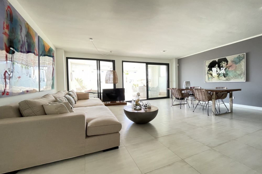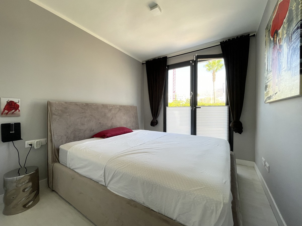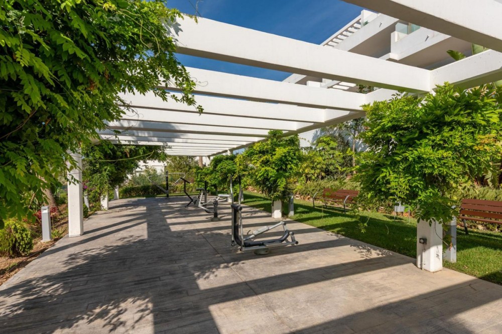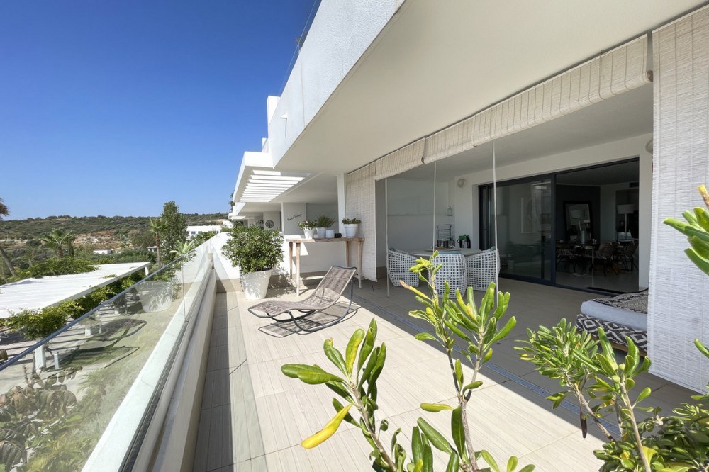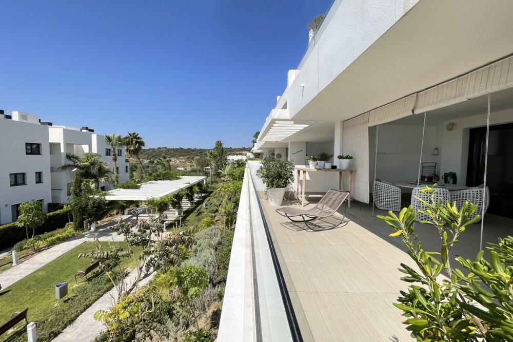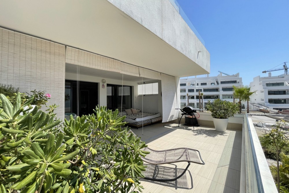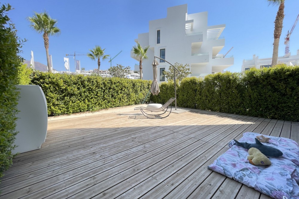 - We present this exceptional ground floor apartment located in the sought-after area of Las Olas, in West Estepona. The property, with a built area of 182m² and 90m² of interior space, stands out for its transformation from the original three bedrooms to a modern two-bedroom design, allowing you to enjoy a 30m² living room, providing greater space and comfort to the living area. It has two bedrooms and two bathrooms, ideal for both families and couples who value space and functionality. The apartment has a 45m² private terrace and a 45m² ground floor patio, both perfect for enjoying the Mediterranean climate, the sun and the partial sea views. The property has a fully equipped open-plan kitchen, separate laundry area, air conditioning and built-in wardrobes that optimise the use of space. The property is part of a gated community that offers a wide range of communal services such as a swimming pool, gardens, lift and video surveillance system. Accessibility is guaranteed for people with reduced mobility, and there is a private garage for added comfort and security. In addition, its proximity to schools, shops, public transport, golf courses, the beach and children's play areas makes it an unbeatable option in Estepona. Complementing the comfort and social life are spaces such as the covered terrace, barbecue and landscaped surroundings, ideal for gatherings with family or friends. This property is in excellent condition and represents a unique opportunity for those seeking quality of life, proximity to services and a privileged location on the Costa del Sol.