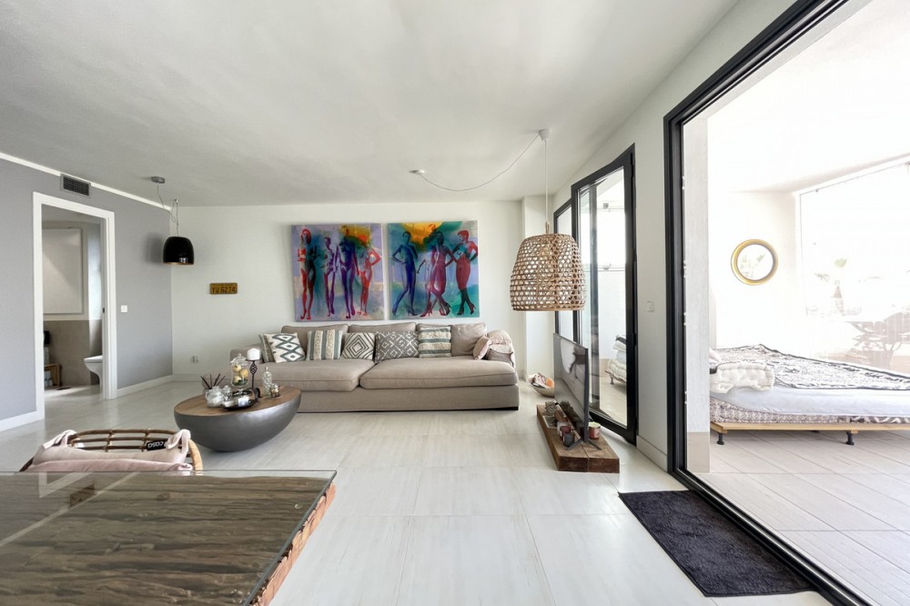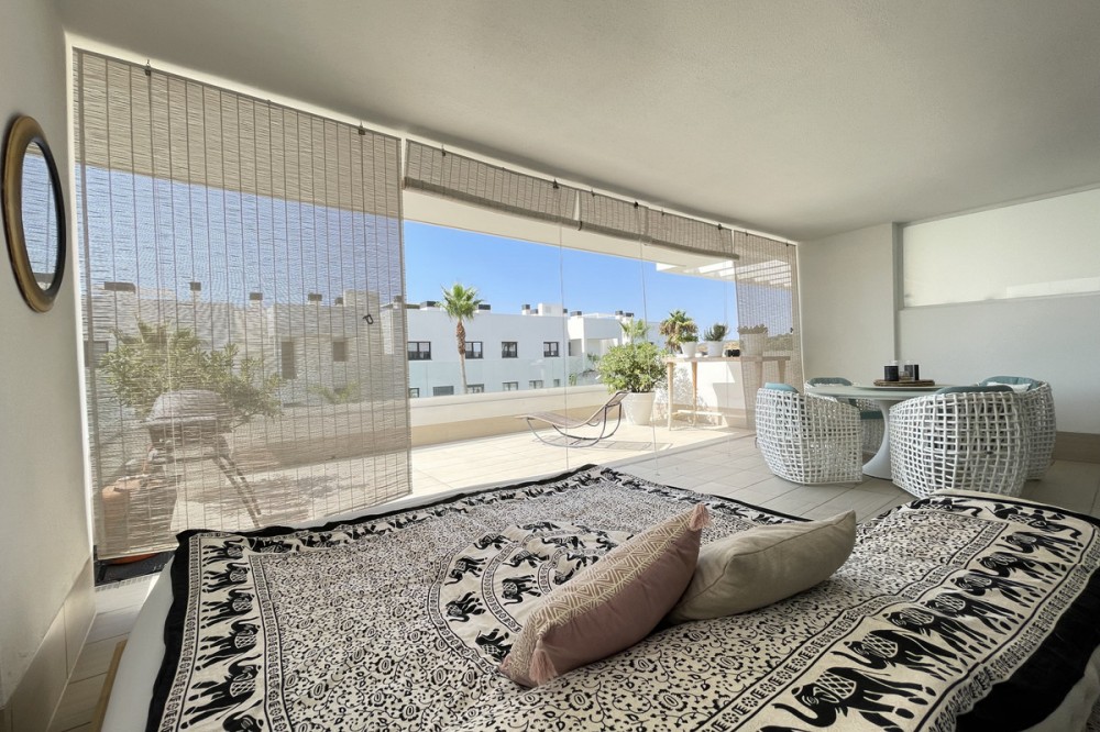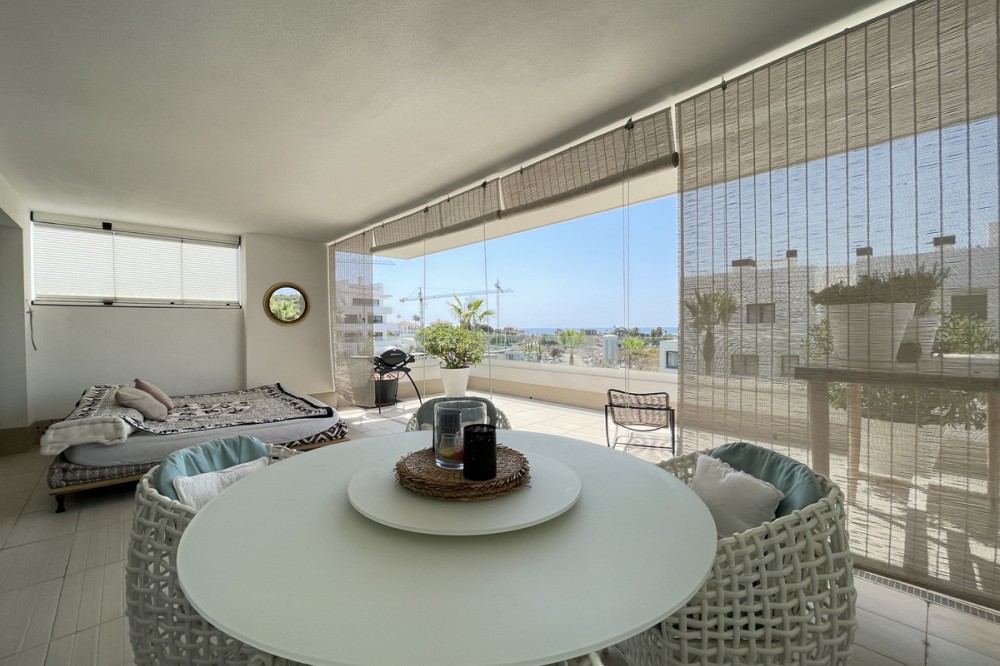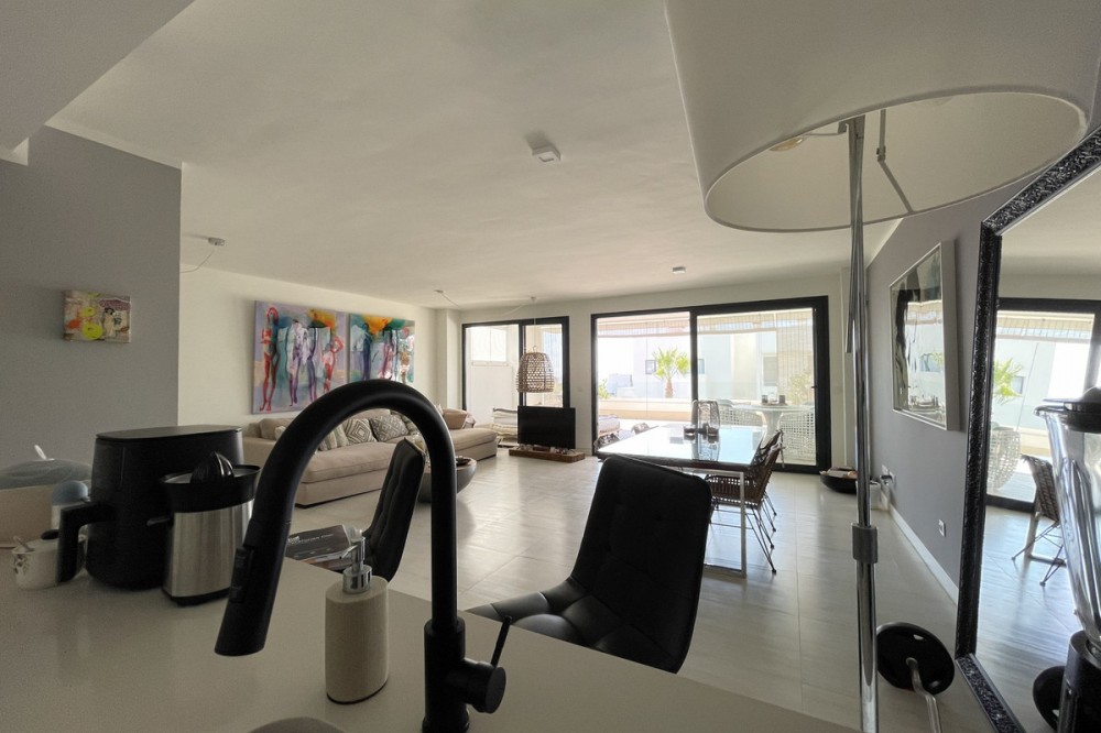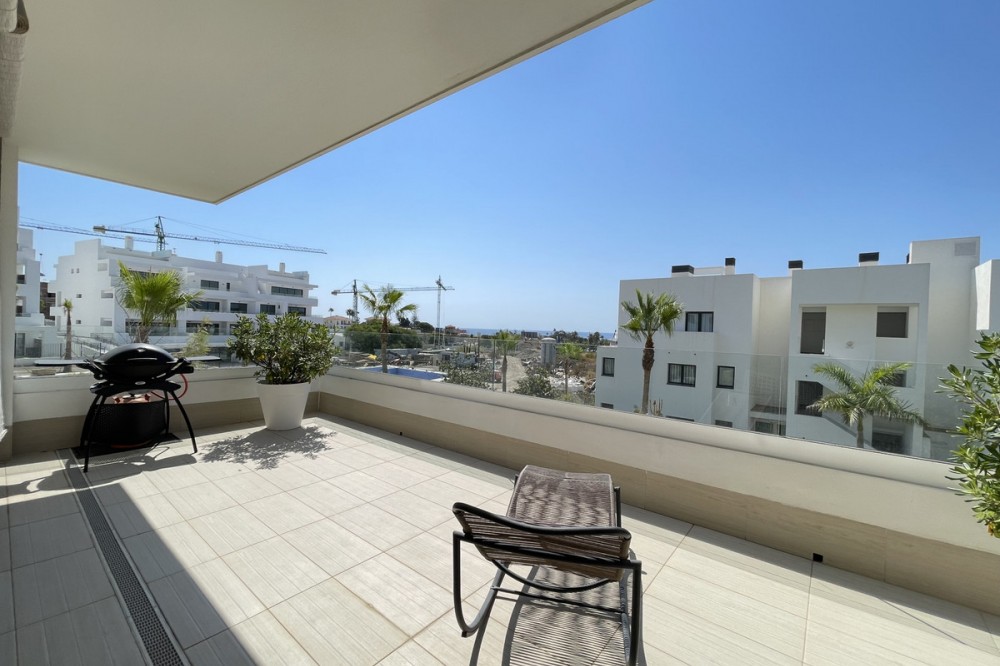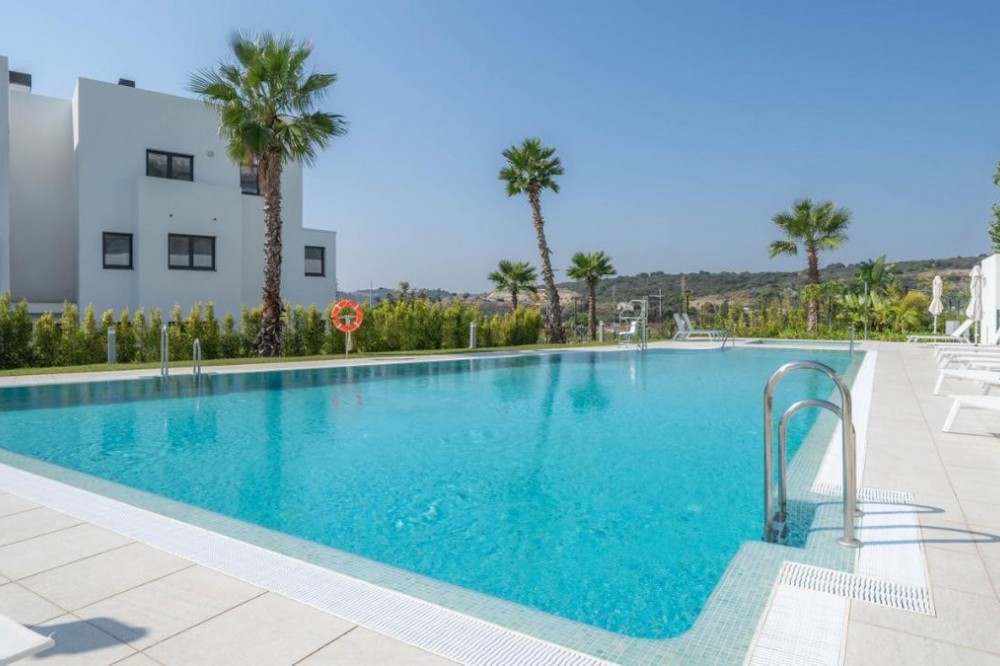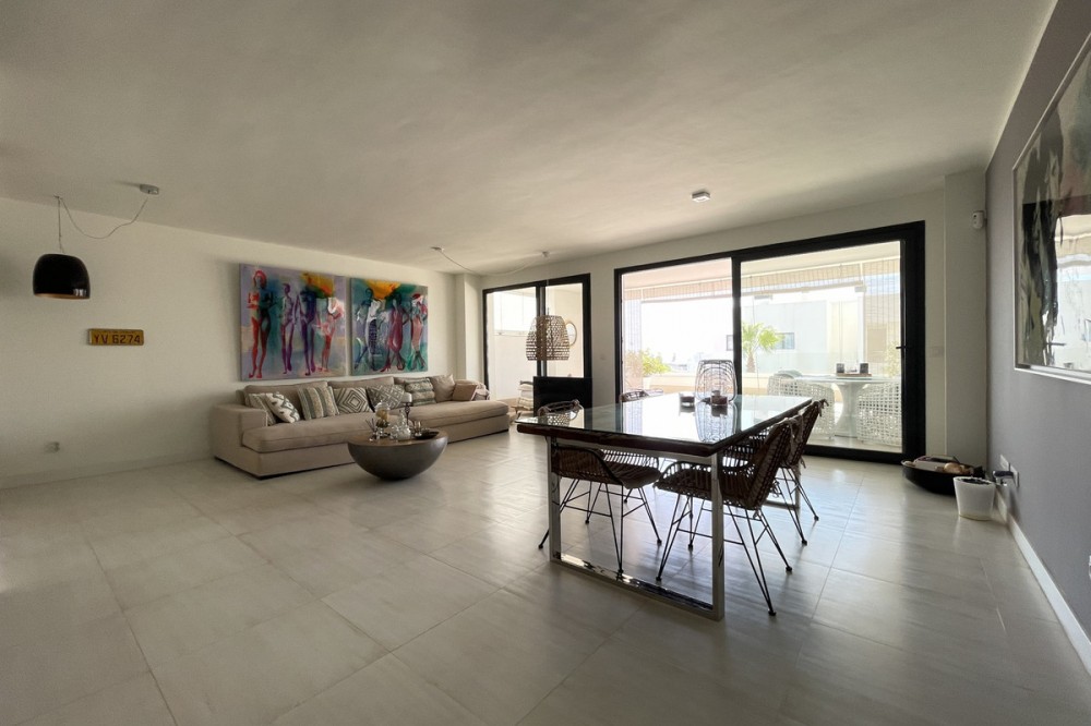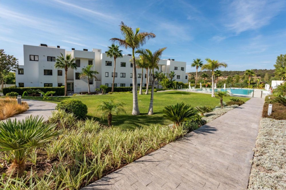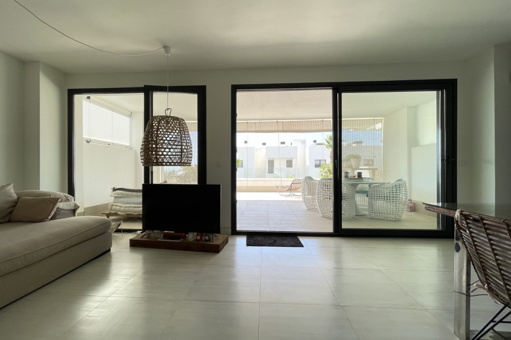 - We present this exceptional ground floor apartment located in the sought-after area of Las Olas, in West Estepona. The property, with a built area of 182m² and 90m² of interior space, stands out for its transformation from the original three bedrooms to a modern two-bedroom design, allowing you to enjoy a 30m² living room, providing greater space and comfort to the living area. It has two bedrooms and two bathrooms, ideal for both families and couples who value space and functionality. The apartment has a 45m² private terrace and a 45m² ground floor patio, both perfect for enjoying the Mediterranean climate, the sun and the partial sea views. The property has a fully equipped open-plan kitchen, separate laundry area, air conditioning and built-in wardrobes that optimise the use of space. The property is part of a gated community that offers a wide range of communal services such as a swimming pool, gardens, lift and video surveillance system. Accessibility is guaranteed for people with reduced mobility, and there is a private garage for added comfort and security. In addition, its proximity to schools, shops, public transport, golf courses, the beach and children's play areas makes it an unbeatable option in Estepona. Complementing the comfort and social life are spaces such as the covered terrace, barbecue and landscaped surroundings, ideal for gatherings with family or friends. This property is in excellent condition and represents a unique opportunity for those seeking quality of life, proximity to services and a privileged location on the Costa del Sol.
