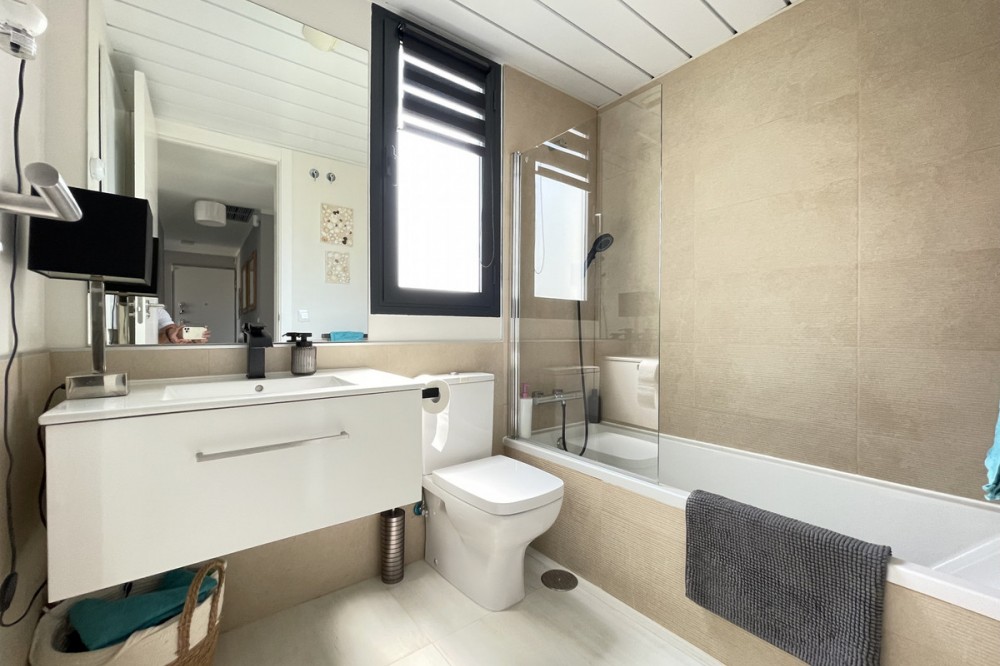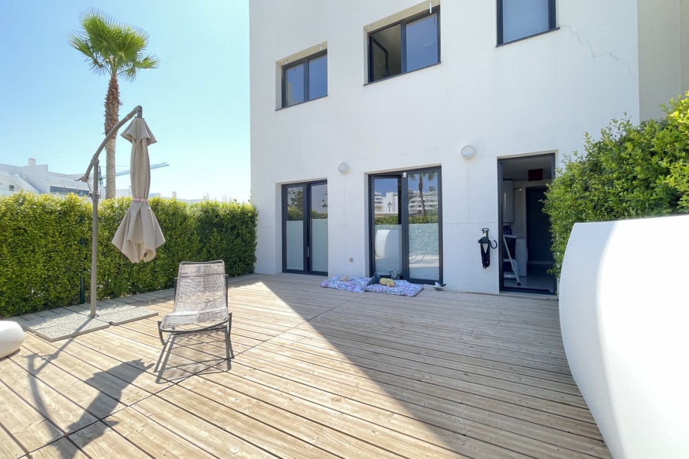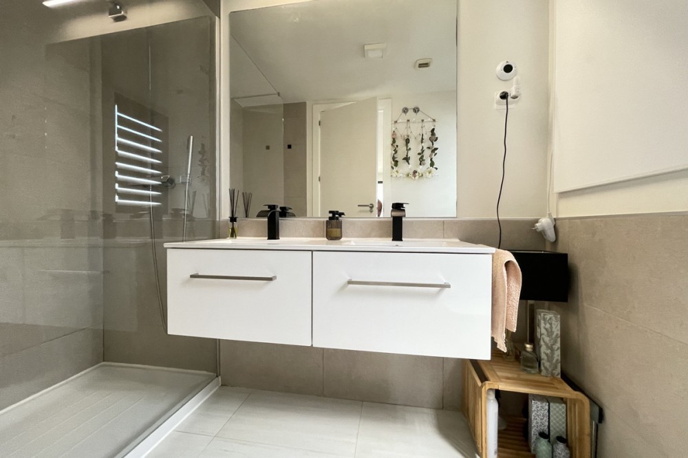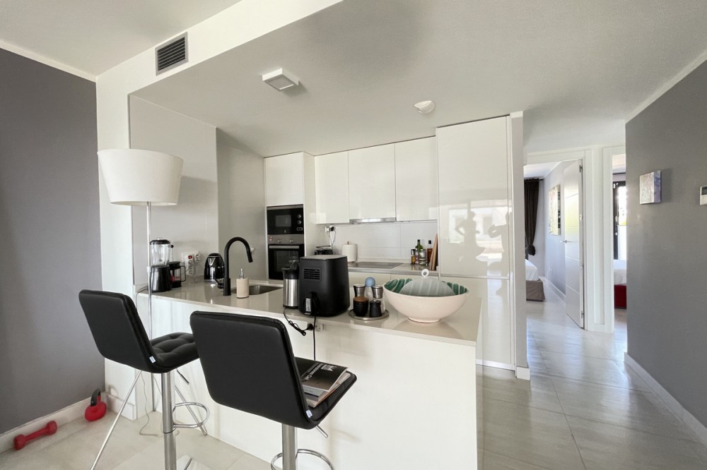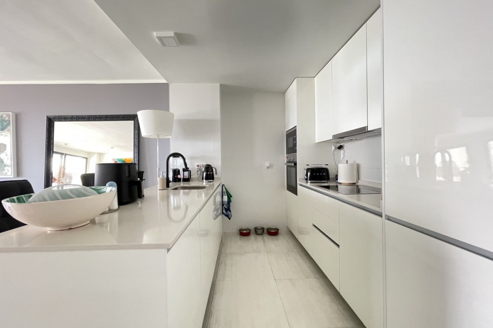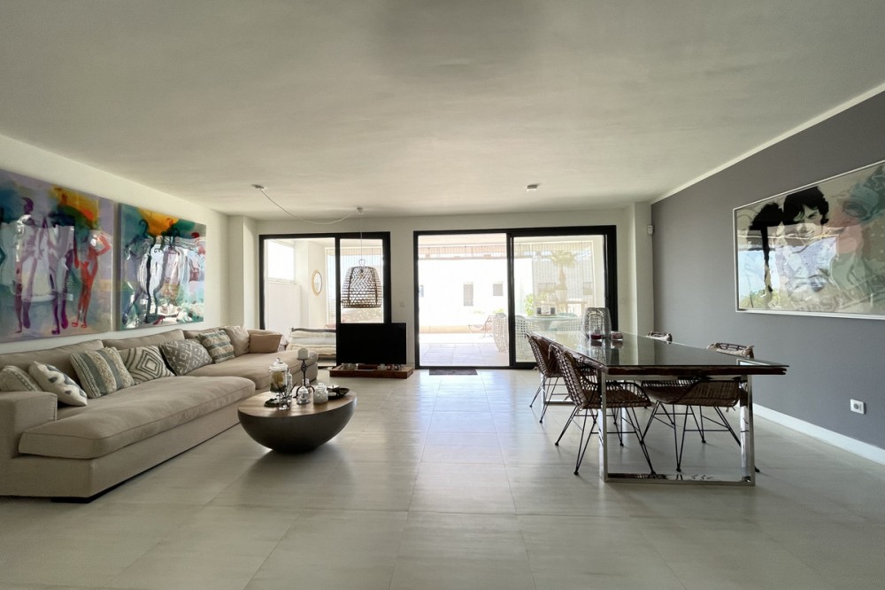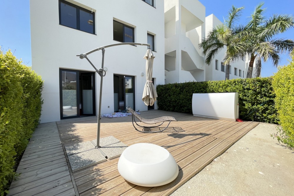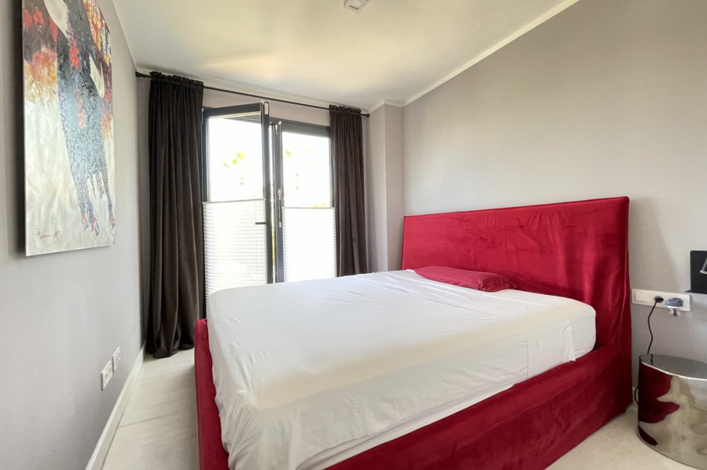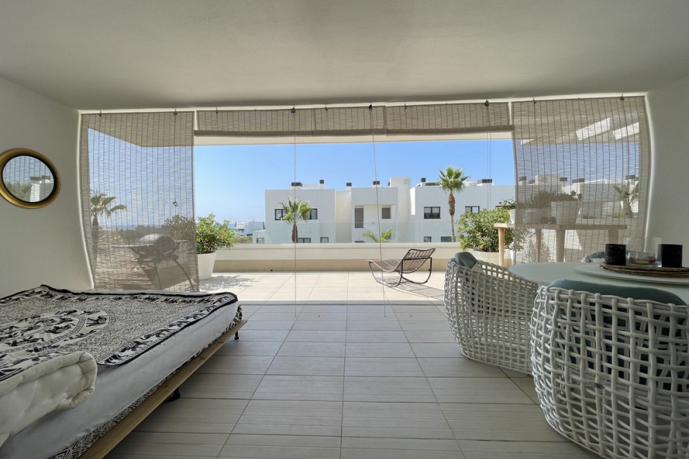 - We present this exceptional ground floor apartment located in the sought-after area of Las Olas, in West Estepona. The property, with a built area of 182m² and 90m² of interior space, stands out for its transformation from the original three bedrooms to a modern two-bedroom design, allowing you to enjoy a 30m² living room, providing greater space and comfort to the living area. It has two bedrooms and two bathrooms, ideal for both families and couples who value space and functionality. The apartment has a 45m² private terrace and a 45m² ground floor patio, both perfect for enjoying the Mediterranean climate, the sun and the partial sea views. The property has a fully equipped open-plan kitchen, separate laundry area, air conditioning and built-in wardrobes that optimise the use of space. The property is part of a gated community that offers a wide range of communal services such as a swimming pool, gardens, lift and video surveillance system. Accessibility is guaranteed for people with reduced mobility, and there is a private garage for added comfort and security. In addition, its proximity to schools, shops, public transport, golf courses, the beach and children's play areas makes it an unbeatable option in Estepona. Complementing the comfort and social life are spaces such as the covered terrace, barbecue and landscaped surroundings, ideal for gatherings with family or friends. This property is in excellent condition and represents a unique opportunity for those seeking quality of life, proximity to services and a privileged location on the Costa del Sol.