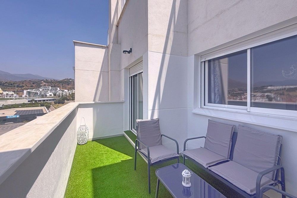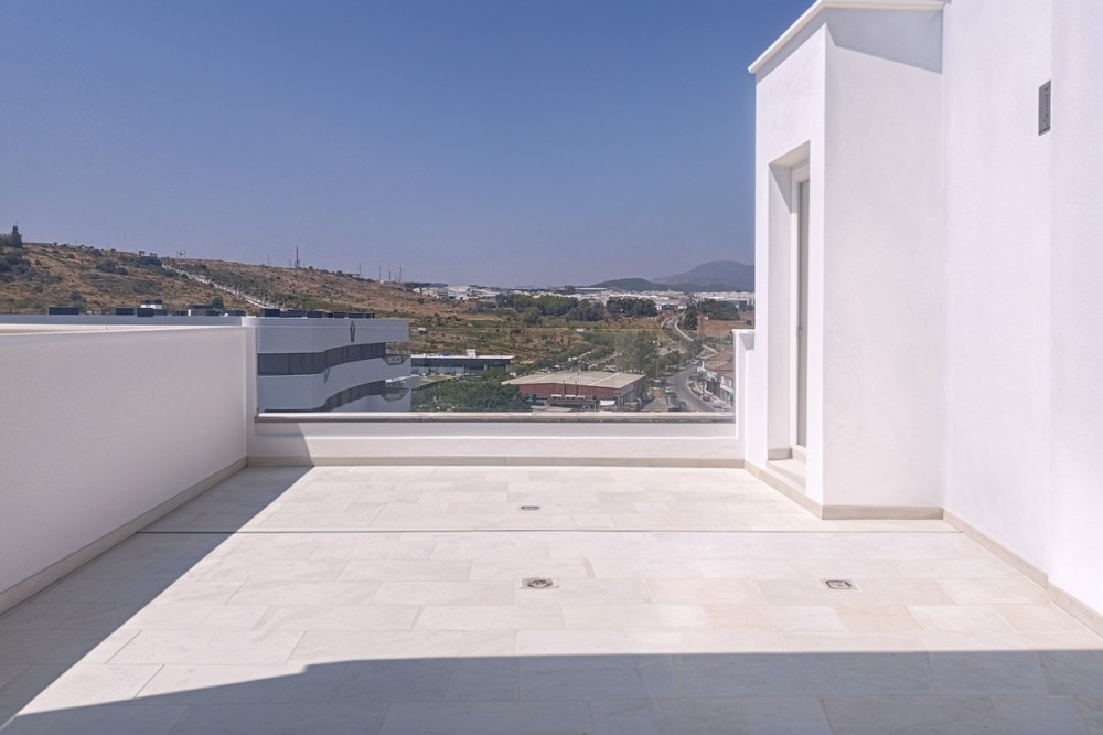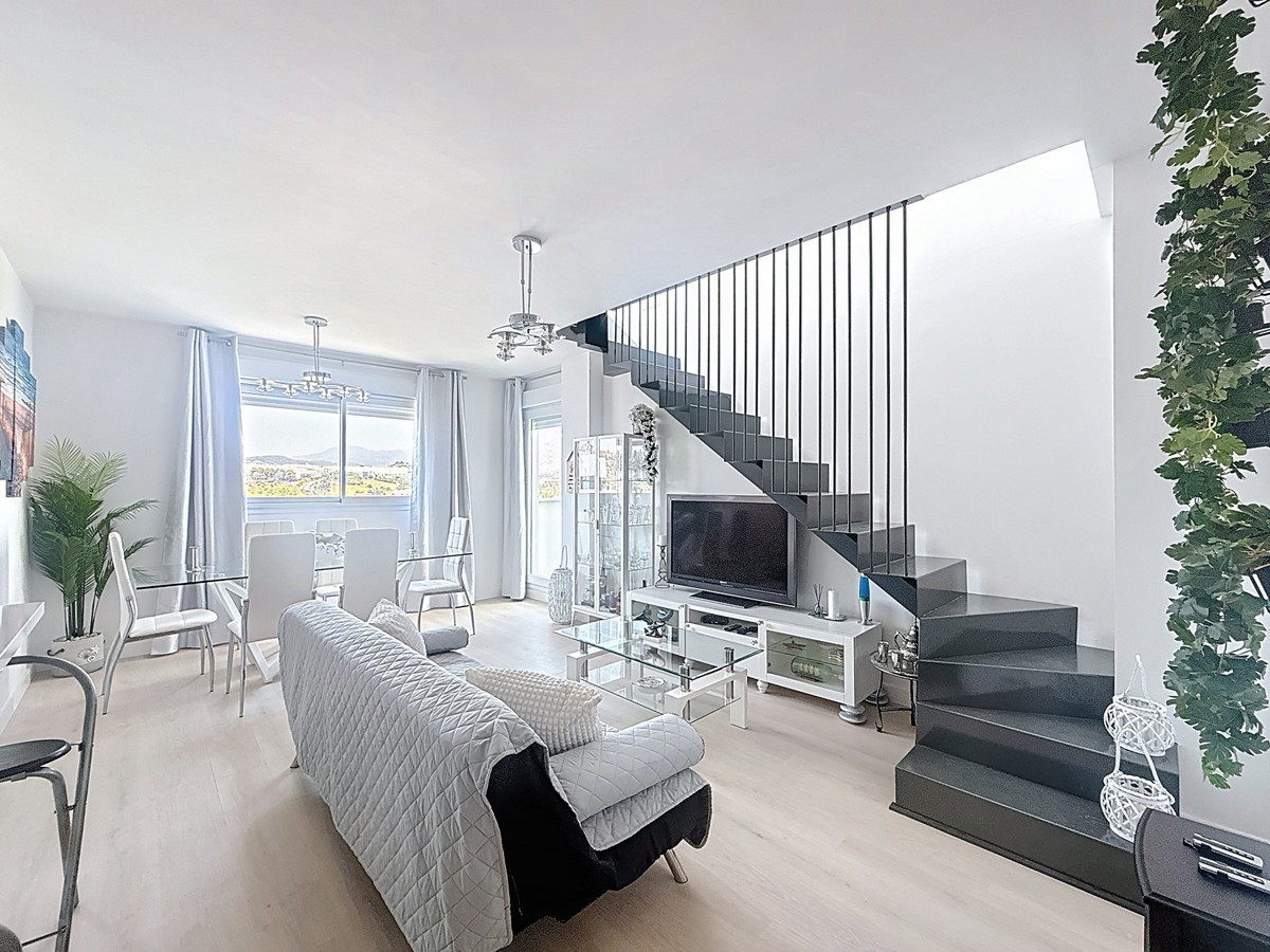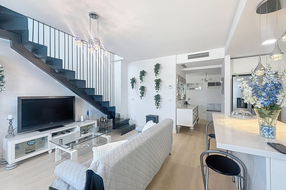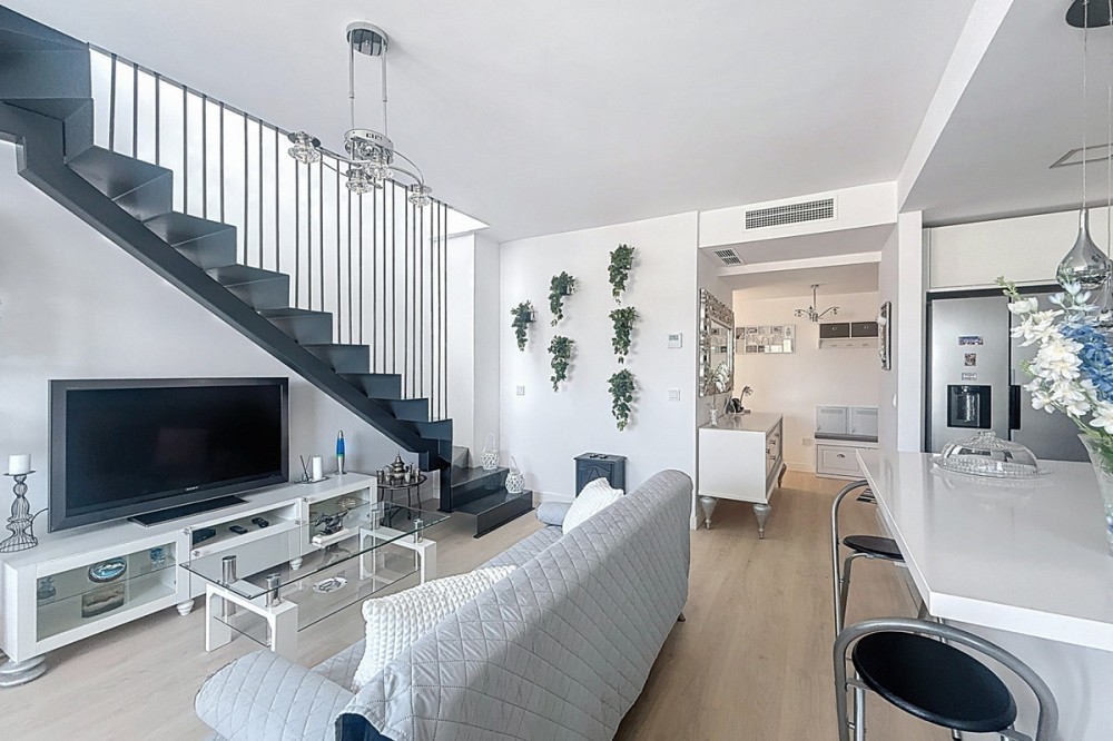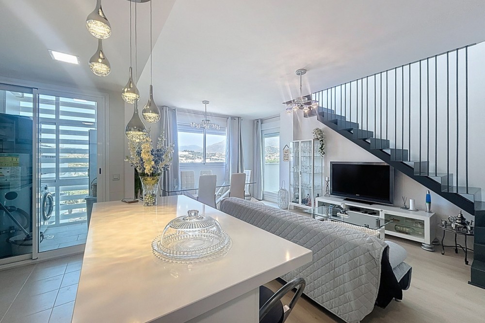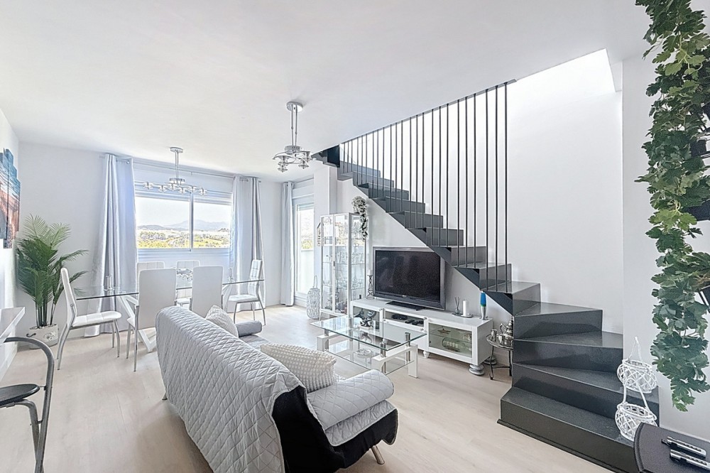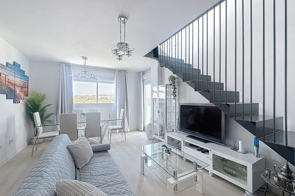 - Located in the very centre of Estepona, this modern duplex penthouse offers the perfect combination of urban convenience and Mediterranean charm. Its privileged setting places you within walking distance of shops, schools, playgrounds, public transport, and just minutes from the beach, the port, and several golf courses. The property boasts 187 m² built (101 m² interior), smartly distributed over two levels. It features 3 bedrooms and 2 bathrooms (one en suite), making it ideal for families or for those seeking extra space. The home is presented in excellent condition, fully furnished and equipped with air conditioning and an aerothermal system for maximum energy efficiency. The open-plan kitchen connects seamlessly with the living and dining area, which flows out to a private terrace with wonderful views of the mountains. The upper level is home to a fantastic private 30m² solarium, perfect for sunbathing, entertaining, or simply enjoying the Costa del Sol lifestyle. Additional features include a laundry room, storage room, and private parking space included in the price. On the rooftop of the building, residents also benefit from a communal swimming pool, an ideal spot to relax on warm summer days. Built in 2021 and situated on the 7th floor with lift, this penthouse is ready to move into and offers the rare chance to enjoy a modern home in one of Estepona’s most desirable areas. Key Features 187 m² built | 101 m² usable 3 bedrooms | 2 bathrooms (1 en suite) Private terrace + solarium Private parking & storage room Built in 2021 | Excellent condition Communal rooftop pool 7th floor with lift A unique opportunity to experience Estepona at its best — combining location, comfort, and lifestyle in one exceptional property.
