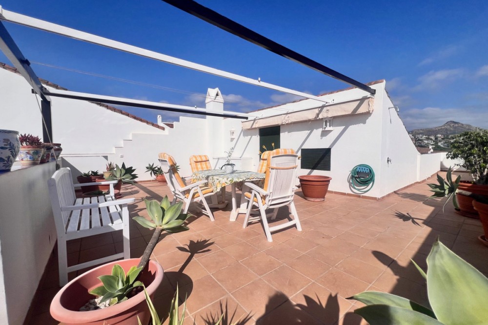 - This beautiful penthouse is located in the quiet and well-kept residence Las Jacarandas in Bel Air, within walking distance of supermarkets such as Mercadona and Lidl, and a short distance from Costalita beach. The house has a bright living room with direct access to a south facing terrace, from where you already enjoy a beautiful sea view. Via a staircase you reach the spacious roof terrace, where you will be treated to a spectacular panoramic view: on one side the Mediterranean and on the other the Sierra Bermeja and the iconic mountain La Concha. At this solarium there is also a practical storage room. The penthouse offers 2 bedrooms and 2 bathrooms, as well as a fully installed kitchen with access to a cozy terrace overlooking the lush communal gardens and pool. An underground parking lot is included. The residence is very quiet and security is provided in the evening. Holiday rentals are not allowed, making this the ideal place for those looking for peace, comfort and security, yet wanting to live close to all amenities.