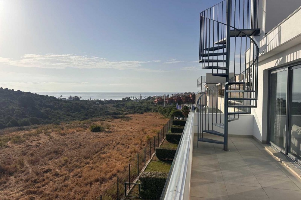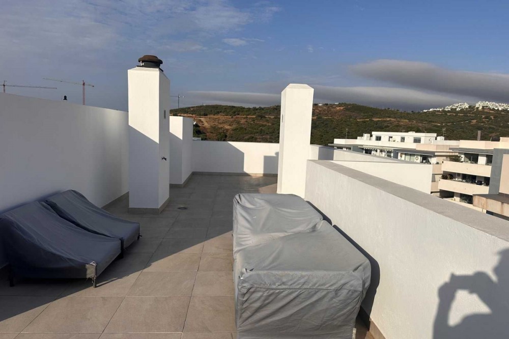 - Contemporary and luxury penthouse with roof terrace in top-condition - Estepona west close to the beaches and amenities! Construction finished a few years ago in gated complex with community gardens and swimming pool. A total built area of 286 sqm; internal area of 126 sqm + 80 sqm of terraces including a roof terrace. Distributed in spacious salon with american open plan kitchen, outgoing to one of the terraces, which is partly covered and has open and unobstructed sea views. 3 bedrooms and 2 bathrooms, on en-suite to the master bedroom. All bedrooms are with built-in wardrobes. Included in the price is a very spacious underground parking place and a 8 sqm storage room. The property is newly high quality furnished, not included in the price but the furnitures are negotiable. All rooms are on the entrance level, the roof terrace on the 2nd level of the penthouse, accessable from the lower main terrace with amazing panoramic views torwards the surroundings up to the sea. Features: parkett flooring, double glazing, security entrance door, sun blinds, bright and light-filled apartment, new furnished and completely fitted luxury kitchen, roof terrace, 3 more terraces, built-in wardrobes, elevator, gated complex, alarm system, WIFI, aircondition hot/cold, video entry phone, undergroud garage, storage room. Top location! Close to the beaches and just a short drive at the outskills of Estepona and Estepona port. Surrounded by several of the best golf course, like Estepona Golf, Camarate Golf, Azata Golf, Casares Golf and Finca Cortesin Golf & Country Club. An international school is close by as well as the new General Hospital, which is only 6 minutes drive away. Totaly quiet area but close to everything. 45 minutes drive to Malaga airport or to the south to Gibraltar airport. 70% mortgage of purchase price is offered from Spanish Banks for this property.