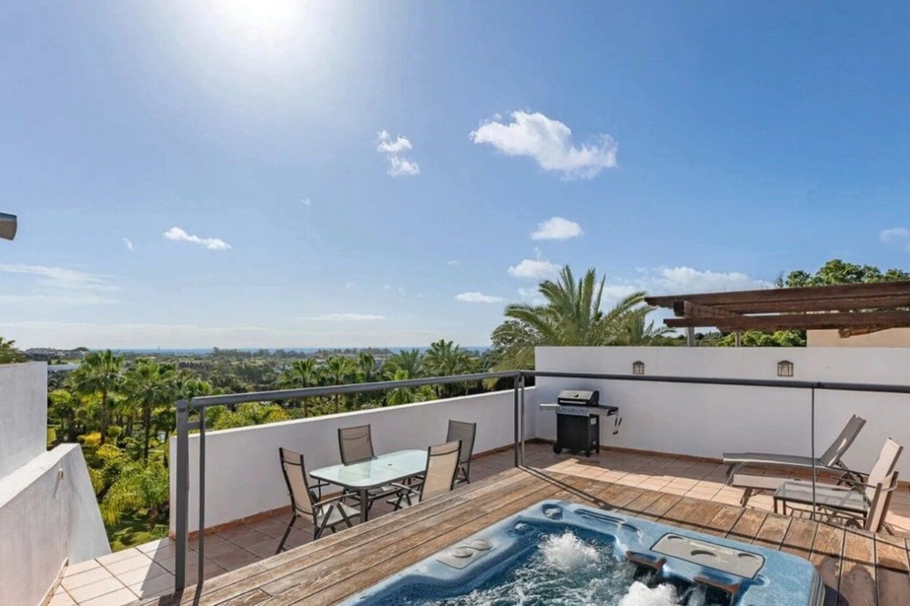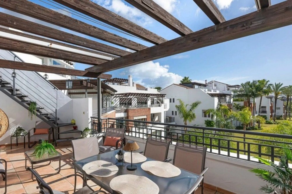 - Just listed in Palm Gardens, Estepona East! This spacious duplex apartment offers 2 bedrooms, 2 bathrooms, and a generous 148 sqm of interior living space, complemented by approximately 60 sqm of terraces. Bright and airy throughout, the apartment enjoys plenty of natural light and boasts beautiful sea views. The layout features a comfortable living and dining area with direct access to a large terrace—ideal for relaxing or entertaining. Upstairs, the master suite includes its own private terrace, perfect for enjoying the sunsets. The property comes with a private underground parking space and a large storage room. Built in 2007 and very well maintained, it’s ready to move into. Palm Gardens s a well-kept community offering residents landscaped gardens, a swimming pool, and peaceful surroundings, all within a short drive of Estepona’s beaches, golf courses, and amenities. A fantastic opportunity to own a stylish home in a sought-after location on the Costa del Sol. Contact us today for more information or to arrange a viewing!