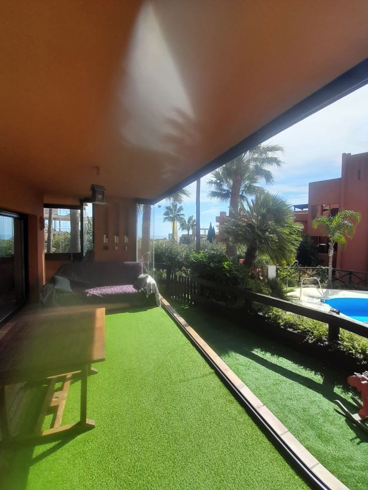 - Spacious Ground-Floor Apartment in Jardines de Nueva Galera, Estepona – Bright, Pool Access, and Enclosed Terrace! Experience coastal living at its finest in this stunning ground-floor apartment in the desirable Jardines de Nueva Galera complex, Urbanización Buenas Noches, Estepona. Boasting an enviable east, south, and west orientation for incredible natural light all day long, this very spacious and luminous 133 m² built (123 m² useful) property is perfect for year-round comfort. With direct access to the community pool from your private terrace, it's an ideal retreat for families or those seeking a serene holiday home on the Costa del Sol. Key Features: Bright and Airy Layout: Entrance hall leading to an independent kitchen with laundry room; expansive living room flooded with light from a large window and two side windows, providing access to the generous terrace with direct pool entry. Comfortable Bedrooms: 2 double bedrooms – the master en-suite with private bathroom, built-in wardrobe, and terrace access offering pool views; the second with a built-in wardrobe. High-Quality Finishes: Aluminum exterior carpentry, white-lacquered doors, air conditioning throughout, and built-in wardrobes for modern elegance. Outdoor Haven: Large terrace enclosed with premium Lumon glass curtains for year-round use, plus community garden and swimming pool. Practical Inclusions: Garage space suitable for a large car plus motorcycle, and a dedicated storage room – all included in the price. Convenient Amenities: Elevator in the building, ensuring accessibility even on the ground floor. Nestled in a peaceful urbanization, this apartment combines space, light, and convenience – just moments from Estepona's beaches, amenities, and vibrant lifestyle. Contact us today to schedule a viewing!