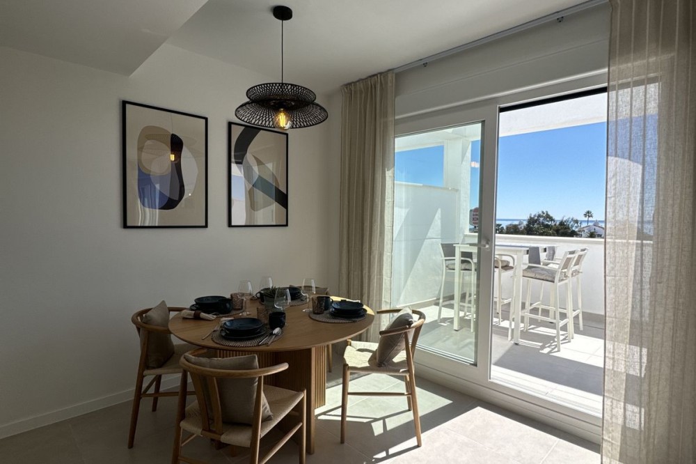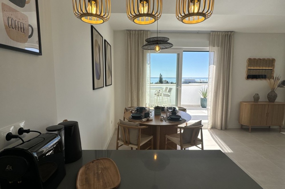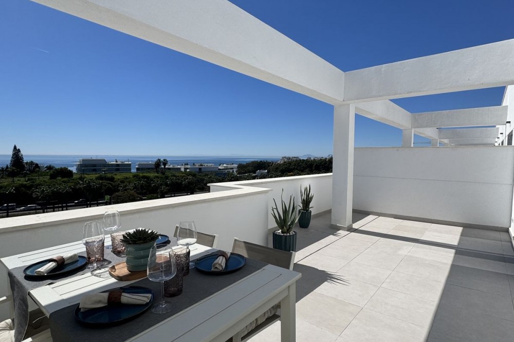 - This TOP FLOOR penthouse is located in a newly build development Celere Sea View in Estepona (Malaga), located in a newly developing built-up area, only 5 minutes from the town centre and the Estepona Marina. This location offers many leisure and service opportunities. Right next to the development you will find your daily supermarkets, as well as restaurants, school, sport center, the Estepona High Resolution Hospital all surrounded by several golf courses within a 5km radius, including Doña Julia Golf, Finca Cortesín Golf Club, Estepona Golf and Valle Romano Golf. This area is developing rapidly and has the potential to increase prices. This development is newly built, completed in November 2024. It consists of 3 intimate blocks of flats, ideally located; there are two supermarkets, a pharmacy and two restaurants right next to it and the beach is 300 meters away. The complex has a swimming pool, relaxation area and gym. The apartment is located on the top floor and has fantastic panoramic sea views from the terrace. The price includes a parking place in the underground garage and a storage room. This property meets all the conditions for short or long-term rental and is an ideal opportunity to invest funds.