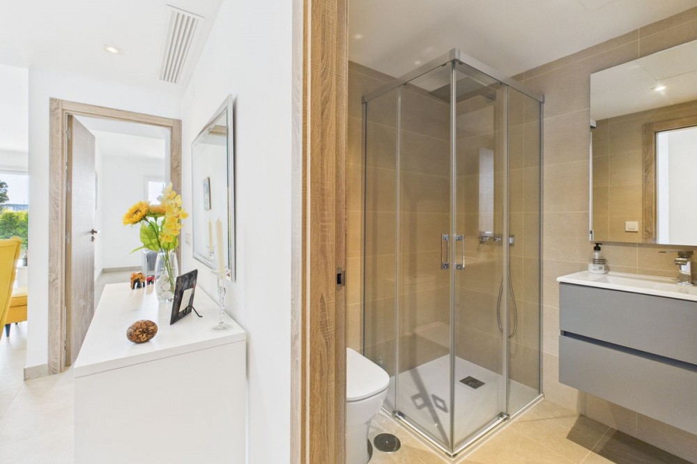 - Modern 2-Bedroom Ground Floor Apartment – Sunny Golf, Estepona Located within the newly completed Sunny Golf development in Estepona, this 2-bedroom, 2-bathroom ground floor apartment combines contemporary design with the relaxed Andalusian lifestyle. Set in a secure gated community surrounded by golf courses and natural beauty, the property offers a peaceful yet well-connected location just a short drive from beaches, shops, and the vibrant heart of Estepona town. Completed in 2024, the apartment enjoys a bright and spacious open-plan layout, featuring a generous living and dining area that flows seamlessly onto a private terrace with garden and mountain views. With its southwest orientation, the property benefits from sunshine throughout the afternoon and spectacular sunsets over the surrounding hills. Key features include: 2 spacious bedrooms and 2 modern bathrooms Open-plan kitchen and living area with abundant natural light Private terrace ideal for outdoor dining and relaxation Communal swimming pool set within beautifully landscaped gardens overlooking the golf course Secure gated community with modern infrastructure and contemporary design Designated parking space included Perfect as a holiday home, permanent residence, or investment property, this stylish apartment offers all the comforts of modern living within a quiet and well-maintained community. With its desirable orientation, peaceful views, and brand-new construction, this property represents an excellent opportunity to enjoy modern Mediterranean living in one of Estepona’s most up-and-coming residential areas. Book a viewing now, keys are in office.