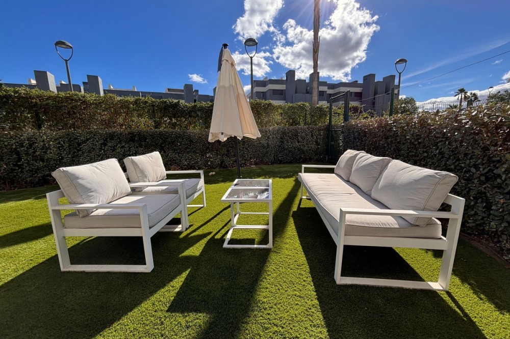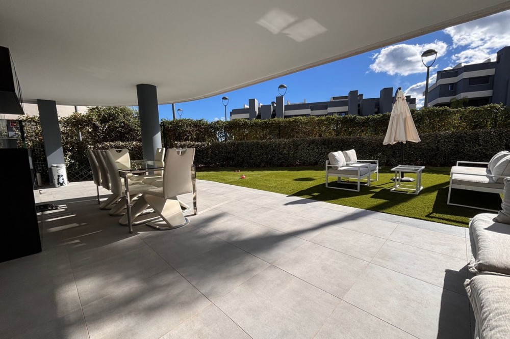 - Modern Mediterranean corner ground-floor apartment located between Estepona and Puerto Banús, offering a unique opportunity to enjoy an exclusive lifestyle in the sought-after area of La Resina. Featuring three bedrooms and two bathrooms, this property stands out for its contemporary design and seamless connection between indoor and outdoor spaces. Its south-facing orientation ensures natural light throughout the day, while the spacious private garden with pool views creates an ideal setting for relaxation or social gatherings in total privacy The open-concept living room, dining area and kitchen flow effortlessly onto the terrace and garden, creating a bright, spacious and welcoming environment. The kitchen is equipped , extended cabinetry and a separate laundry area. The master bedroom includes a charming enclosed terrace that provides an additional sunlit and serene space. All bedrooms feature built-in wardrobes and electric shutters, while the overall finishes reflect a high standard of quality, comfort and style The residential complex offers a range of exclusive amenities designed to enhance the comfort and well-being of its residents, including a heated indoor pool, fully equipped gym, spa with sauna and steam room, and an elegant clubhouse for private events and social gatherings. The landscaped gardens surround a large outdoor swimming pool. In 2025, an exclusive paddle club with eleven courts, wellness area and restaurant will open, further increasing the appeal of this premium community The location is exceptional, with easy access to both Estepona and Puerto Banús and surrounded by top-tier services including the Atlas American School of Málaga with over 700 students, the recently expanded private hospital Hospiten, supermarkets such as Mercadona, Aldi, Lidl and Carrefour, and a diverse culinary offering including trendy beach clubs like Bossa and Sonora. The property includes one underground parking space and a storage room, with the option to purchase a second parking space if desired. The apartment is in excellent condition, ready to move into.