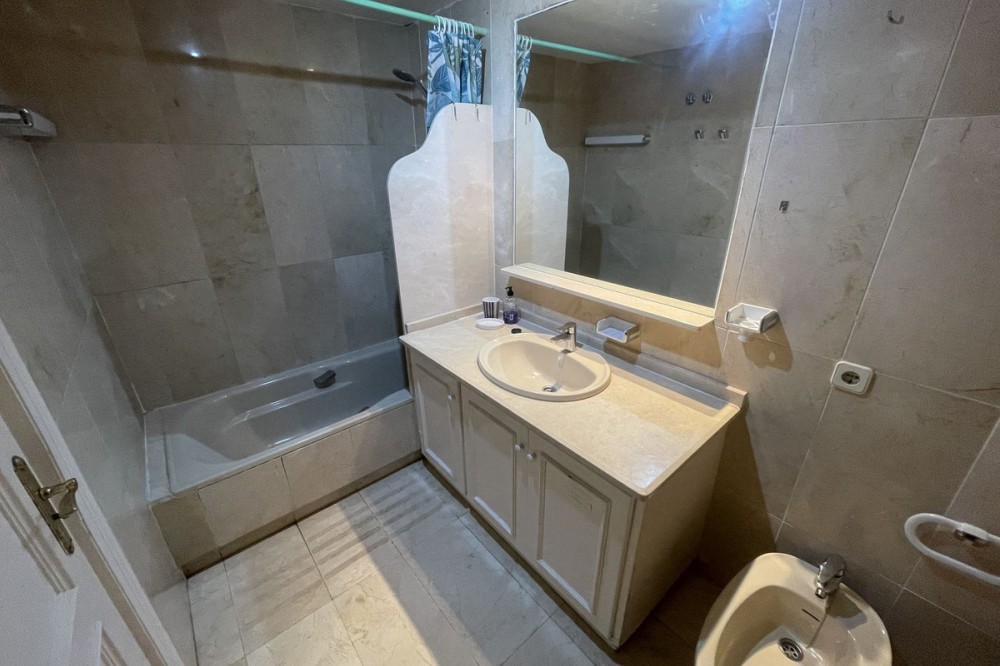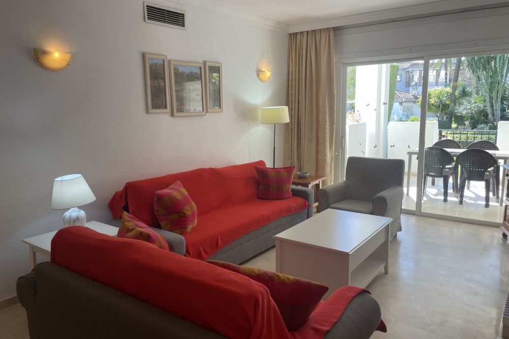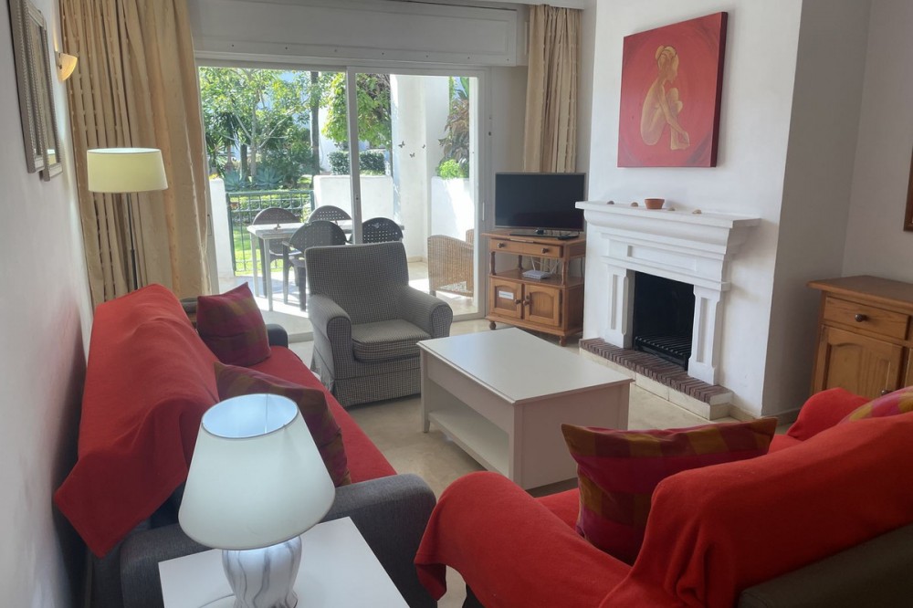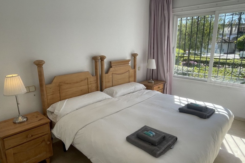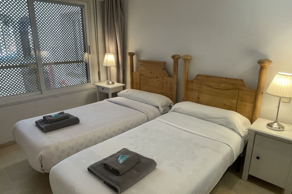 • This apartment is ideal for families with children, as being on the ground floor allows direct access from the terrace to the garden area and the pool. The accommodation consists of a fully equiped kitchen with a washing machine, dishwasher, refrigerator, microwave, oven, and ceramic hob, as well as a large living room with dining area. The master bedroom has two single beds and an en-suite bathroom, while the second bedroom has two single beds and a bathroom with a shower.