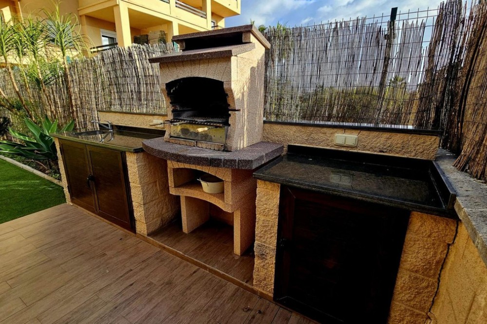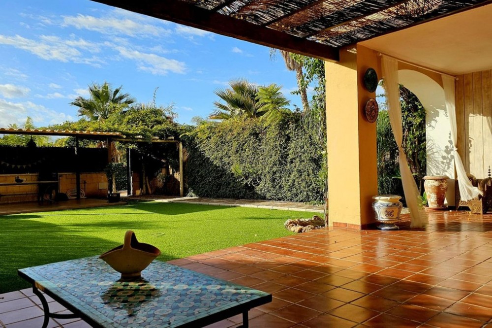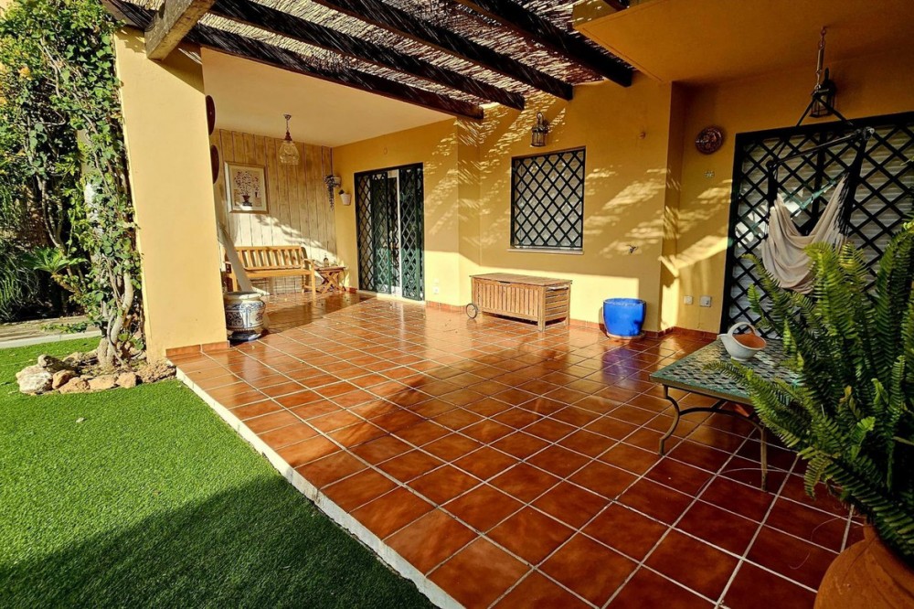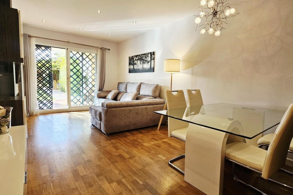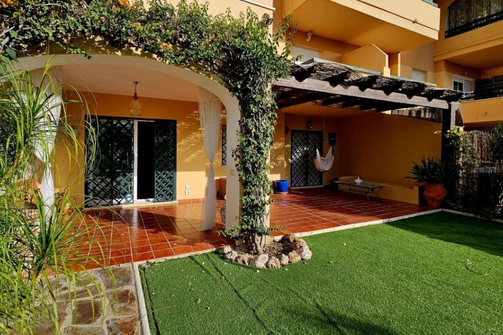 • This beautiful two-bedroom ground-floor apartment boasts a spacious outdoor area. It features a large covered terrace and a spacious private garden with a barbecue, pergola, and direct access to the swimming pool, paddle tennis court, and children's playground. The porch has a pergola, perfect for relaxing or gathering outdoors. The entire garden is paved and covered with high-quality artificial turf, making maintenance easy and ensuring it looks its best year-round. A barbecue area has also been created, equipped with custom-made furniture, a sink, water and electricity connections, and a second pergola that provides shade and comfort, creating an ideal space for meals and outdoor gatherings. Thanks to these improvements, the garden is a practical, comfortable, and modern space, perfect for enjoying time with friends and family. The apartment is located in the prestigious Selwo area, on Estepona's New Golden Mile, near Resina Golf, the new Padel Club, and the American School. Its south-facing orientation guarantees natural light throughout the day. This apartment features two bathrooms, one of which is en-suite with a dressing room and direct access to the terrace and garden; an extended kitchen with a laundry area and access to another terrace; and a bright living-dining room with access to the outdoor areas. It includes hot/cold air conditioning throughout, an underground parking space with direct elevator access to the apartment door, and additional outdoor parking for guests. The community, comprised of only 32 apartments, offers a large swimming pool, a children's playground, and a paddle tennis court. Its excellent location, less than 10 minutes from San Pedro Alcántara and Estepona, and very close to Marbella and Puerto Banús, makes this property a unique opportunity. Thanks to its wonderful outdoor spaces and the area's pleasant climate, it feels like home. A viewing is highly recommended.