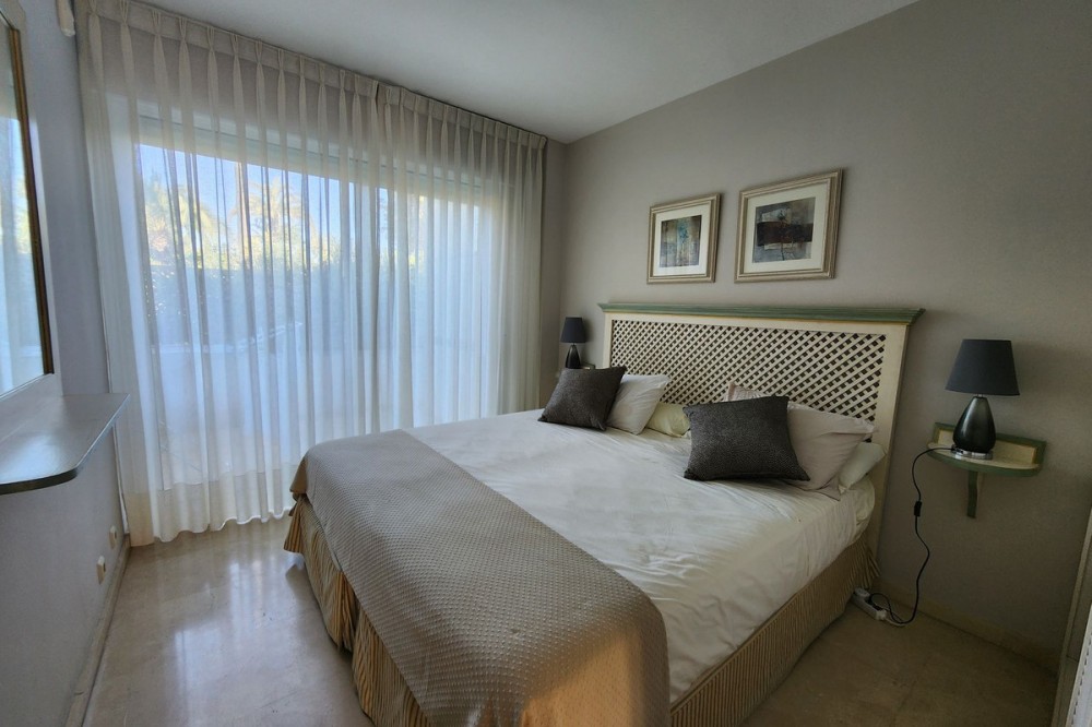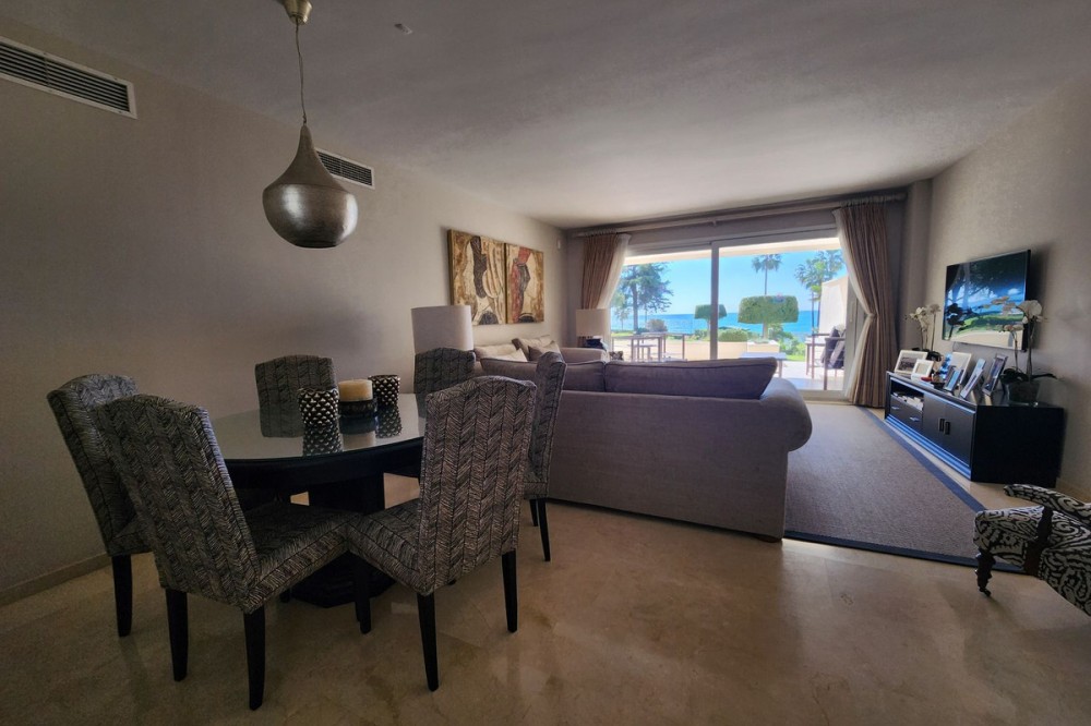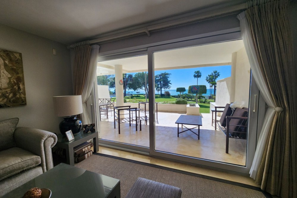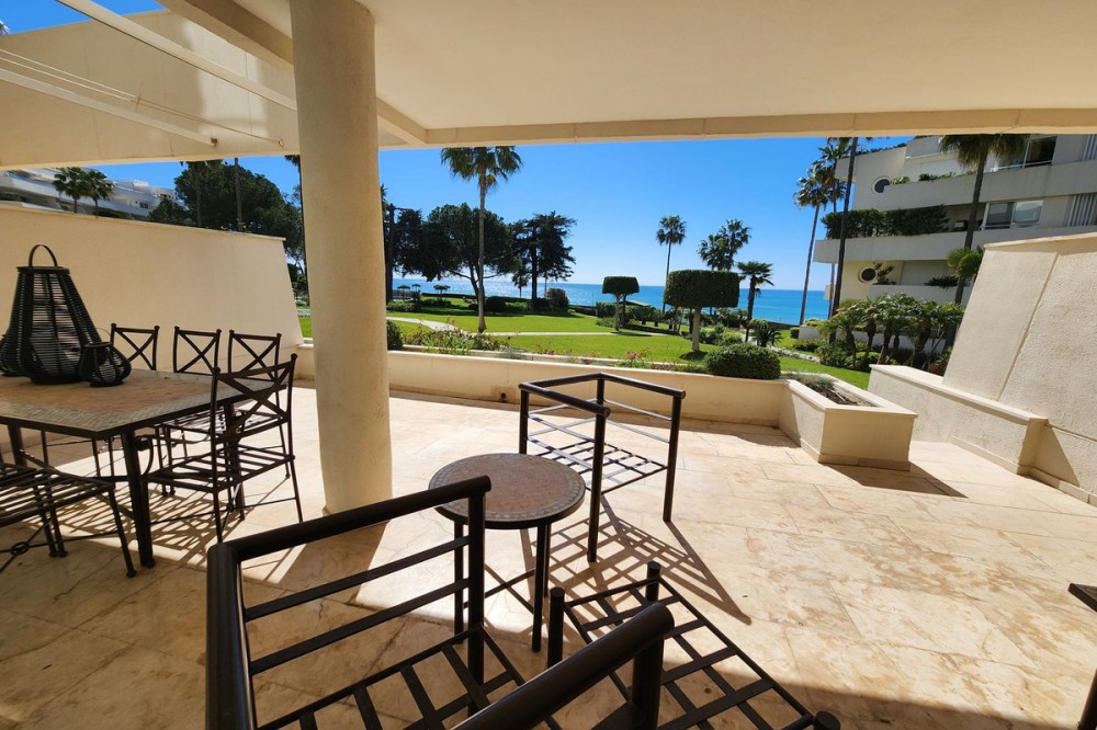 • Ground Floor Apartment, Estepona, Costa del Sol. 3 Bedrooms, 2 Bathrooms, Built 203 m², Terrace 60 m². Setting : Beachfront, Beachside, Close To Shops, Close To Sea, Close To Town, Close To Schools, Urbanisation, Front Line Beach Complex. Orientation : South. Condition : Excellent. Pool : Communal. Climate Control : Air Conditioning, Pre Installed A/C, Hot A/C, Cold A/C. Views : Sea, Garden, Pool. Features : Covered Terrace, Lift, Fitted Wardrobes, Private Terrace, Satellite TV, WiFi, Gym, Paddle Tennis, Tennis Court, Storage Room, Marble Flooring, Double Glazing, 24 Hour Reception. Furniture : Optional. Kitchen : Fully Fitted. Garden : Communal. Security : Gated Complex, 24 Hour Security. Parking : Underground, Street. Utilities : Electricity, Drinkable Water, Telephone. Category : Beachfront, Luxury, Resale.