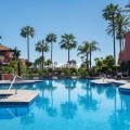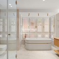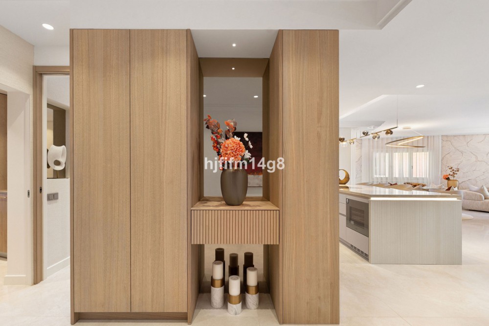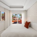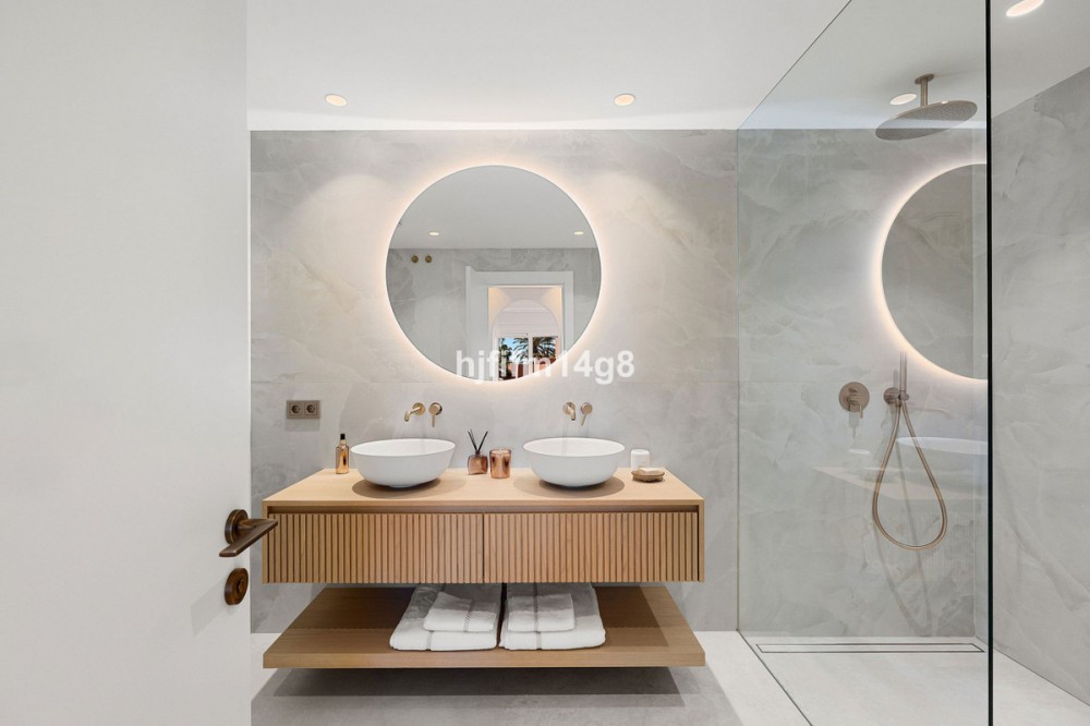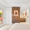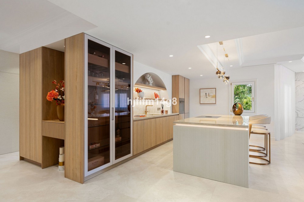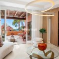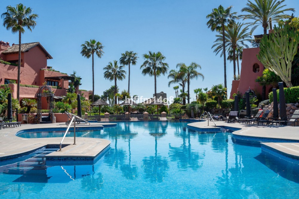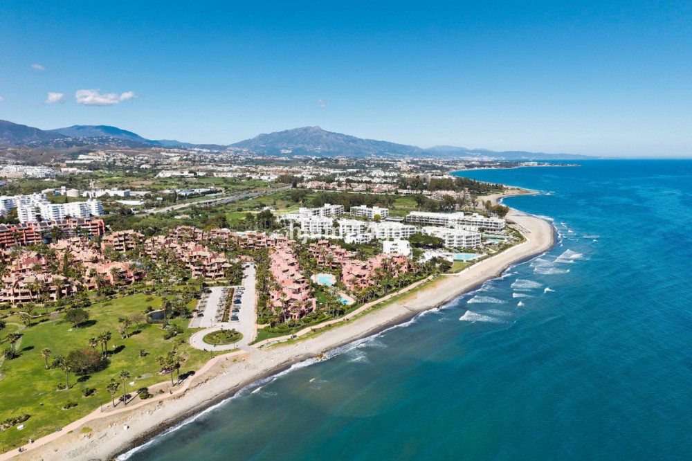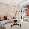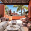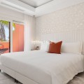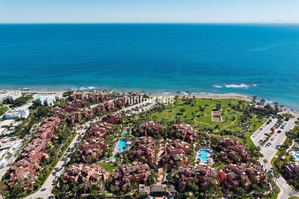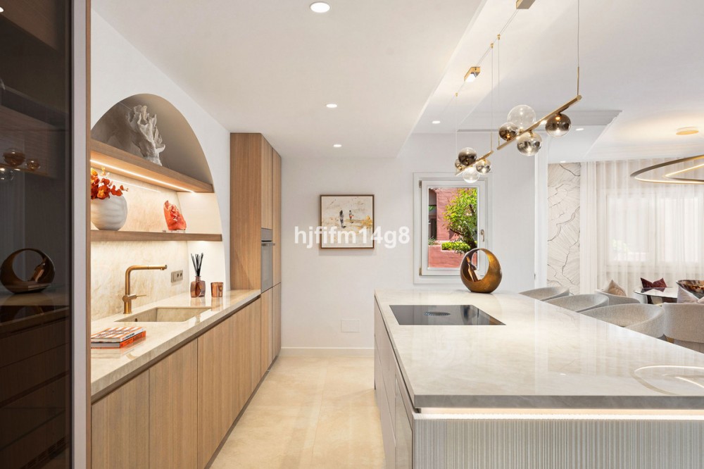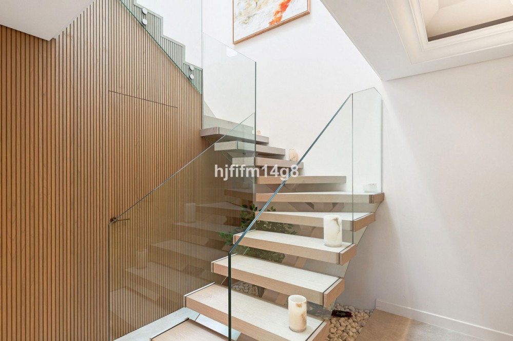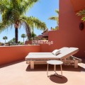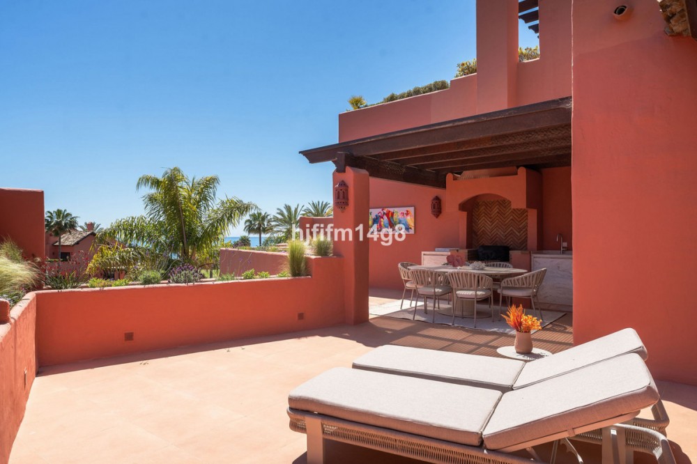 • Dit volledig gerenoveerde duplex penthouse met drie slaapkamers is gelegen in het prestigieuze Torre Bermeja en biedt een uitzonderlijke combinatie van verfijnde elegantie, modern comfort en een toplocatie aan het strand in de zeer gewilde New Golden Mile van Estepona. De woning wordt instapklaar en volledig gemeubileerd opgeleverd, zodat u er direct van kunt genieten, zowel als permanente woning als luxe vakantieverblijf. De exclusieve woonwijk Torre Bermeja staat bekend om haar vijfsterrenvoorzieningen, waaronder 24-uursbeveiliging, prachtig onderhouden tropische tuinen, rustige kunstmatige meren, twee buitenzwembaden met watervallen, een volledig uitgeruste fitnessruimte en een sauna. Bewoners profiteren bovendien van directe toegang tot het strand en de nabijheid van de schilderachtige kustpromenade, waarmee de essentie van elegant mediterraan leven in Estepona perfect wordt weergegeven. Bij binnenkomst in het penthouse wordt u verwelkomd in een lichte en ruime open woonruimte waar de eetkamer, de woonkamer en de volledig uitgeruste keuken naadloos in elkaar overlopen. Deze uitnodigende ruimte komt uit op een royaal terras op het zuiden met zowel overdekte als onoverdekte gedeeltes, ideaal om te ontspannen of te entertainen terwijl u geniet van het uitzicht over de Middellandse Zee, de weelderige gemeenschappelijke tuinen en het zwembad. Op de begane grond bevinden zich tevens twee goed ingerichte gastenslaapkamers, elk met een eigen en-suite badkamer en directe toegang tot het terras, evenals een aparte wasruimte en een gastentoilet. De bovenverdieping is volledig gewijd aan de indrukwekkende master suite, ontworpen als een privétoevluchtsoord. Deze suite beschikt over een inloopkast, een luxe en-suite badkamer en toegang tot een eigen terras op het zuiden. Dit terras biedt zowel schaduwrijke als openluchtgedeeltes, een ingebouwde barbecue en een adembenemend uitzicht op de Middellandse Zee en de prachtig aangelegde tuinen van Torre Bermeja, waardoor het de perfecte plek is om het hele jaar door te genieten van het aangename klimaat van Estepona. Deze uitzonderlijke woning beschikt tevens over twee ondergrondse parkeerplaatsen en twee bergingen, wat naast de vele andere voordelen ook het gemak en de praktische bruikbaarheid vergroot.