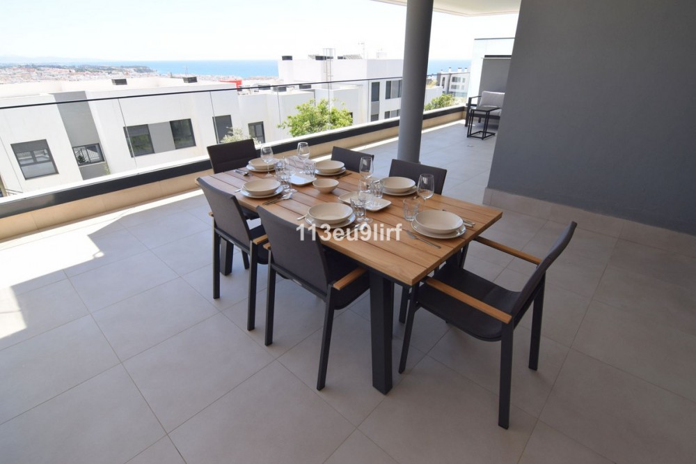 - Situated in Las Mesas, just outside the center of Estepona, this spacious luxury apartment offers peace and tranquility but is still close to the beach, port and city center. It consists of a large living/dining room, a fully equipped kitchen with adjacent utility room, the en suite master bedroom and two more bedrooms sharing a shower room. Additionally there is a covered front terrace with sea views and a small patio at the back. Underground parking space for one car and storage room. The complex with video surveillance is extremely well maintained, with tropical gardens and a beautiful pool. Heated indoor pool and gym (400 meter from the apartment). Air conditioning hot & cold, high speed internet. From the apartment it only takes 15 minutes to walk to Estepona port and the beach and 10 minutes to a large supermarket.