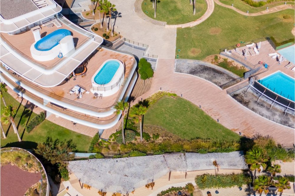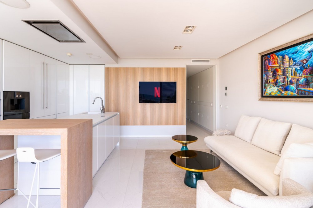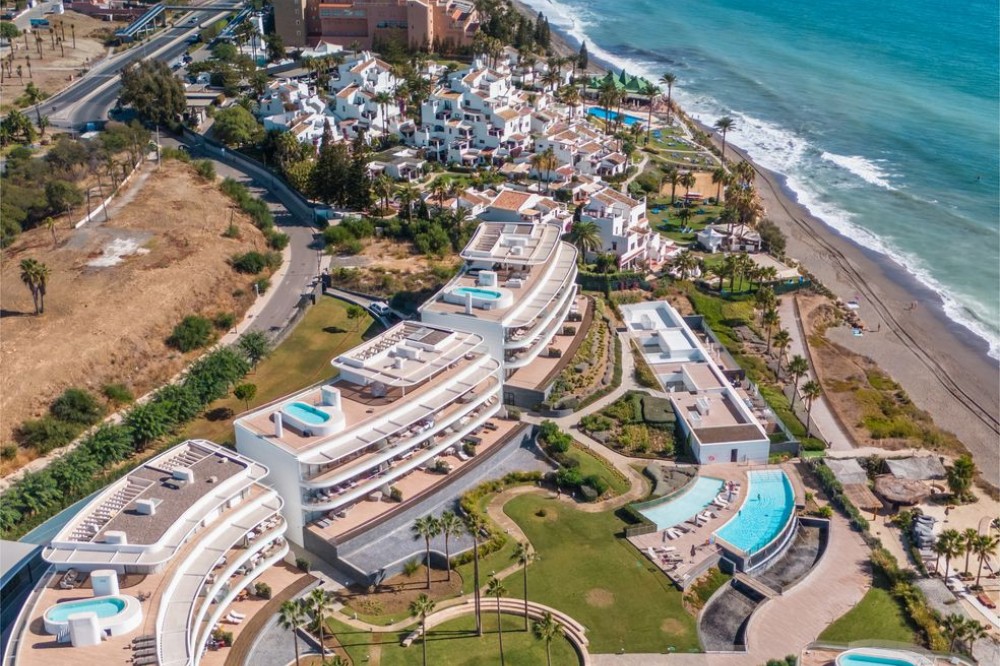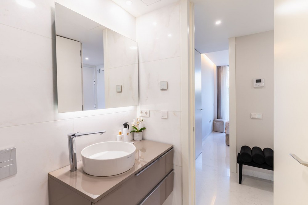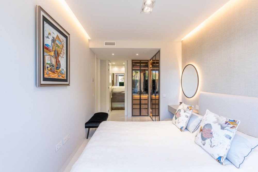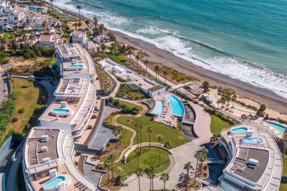 - This stunning modern apartament is located in Estepona's premier beachfront development, awarded with the first prize for ‘Best Architecture Multiple Property’ at the prestigious ‘European Property Awards’. The lovely ground floor features spacious master bedroom with bathroom on suite, guest bedroom with bathroom, both with an access to the private back terrace. The owner makes a lot of upgrades like: marble flooring from Tino or modern and elegant wardrobe in master suite. The bathrooms are finished by the prestigious Dornbracht brand. Kitchen is fully equipped with Gaggenau appliance with double fridge and freezer with ice maker, coffee maschine and warming drawer, ideal for preparing family meals in elegant space. The kitchen area is integrated with the living area. The floor-to-ceiling glass doors gives the bright and lead to the into a generous over 32 m2 terrace and private use garden. Here you can enjoy spectacular sea views. The apartment was designed with great attention to detail and the highest quality of finish, all rooms have LED lighting installed in the ceilings, in the living room there are additional LED floor strips with division into zones and dimmers in all rooms allowing to create a unique atmosphere in the evening. The apartment is located in block 4, it is an elevated ground floor, practically the level of the first floor, which guarantees the best sea views and privacy. The Edge offers their residents access to world- class amenities. The outdoor pool with panoramic views of the Mediterranean Sea and to Gibraltar, large indoor pool, spa with hammam, sauna, jacuzzi and steam room providing a complete wellness experience and make it a perfect place to enjoy the family holidays but also to make your investment profitable. A fully equipped gym and panel court ensure all fitness needs are covered. The development offers also modern design social club co-working space and 24h security. There is a parking space in underfloor garage and storage belongs to the apartament. The location of the complex is unbeatable, situated directly on the beachfront but also close to the restaurants and shops, only few minutes drive to the Marina of Estepona and the city center of Estepona. The distance to the airport is 1h by car Must be seen!