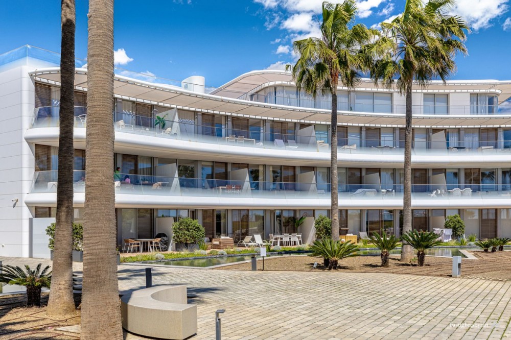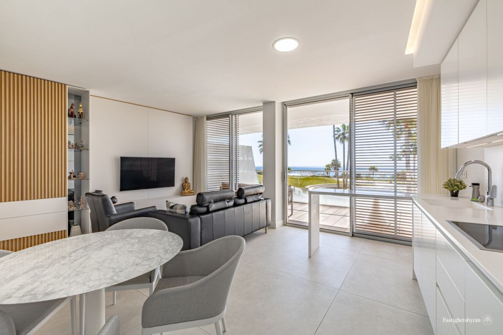 - Spectacular sea views, five minutes drive to Estepona and 15 minutes to Puerto Banus. Modern frontline beach development on the beach promenade, consisting of 68 flats. It has very well kept gardens, infinity pool, conference and meeting room, gymnasium and spa area with indoor heated pool, jacuzzi, hamman and sauna. This spectacular and luminous flat where you can enjoy the best views, has two bedrooms, 2 bathrooms with Dombracht finishes and 2 terraces, the main one with views to the garden and the sea, as well as a spacious open plan living room-kitchen with prestigious Gaggenau appliances, garage, storage room and 24h security. This luxury flat is perfect given its privileged location and the high end services it offers to become your new home. Come and see it.