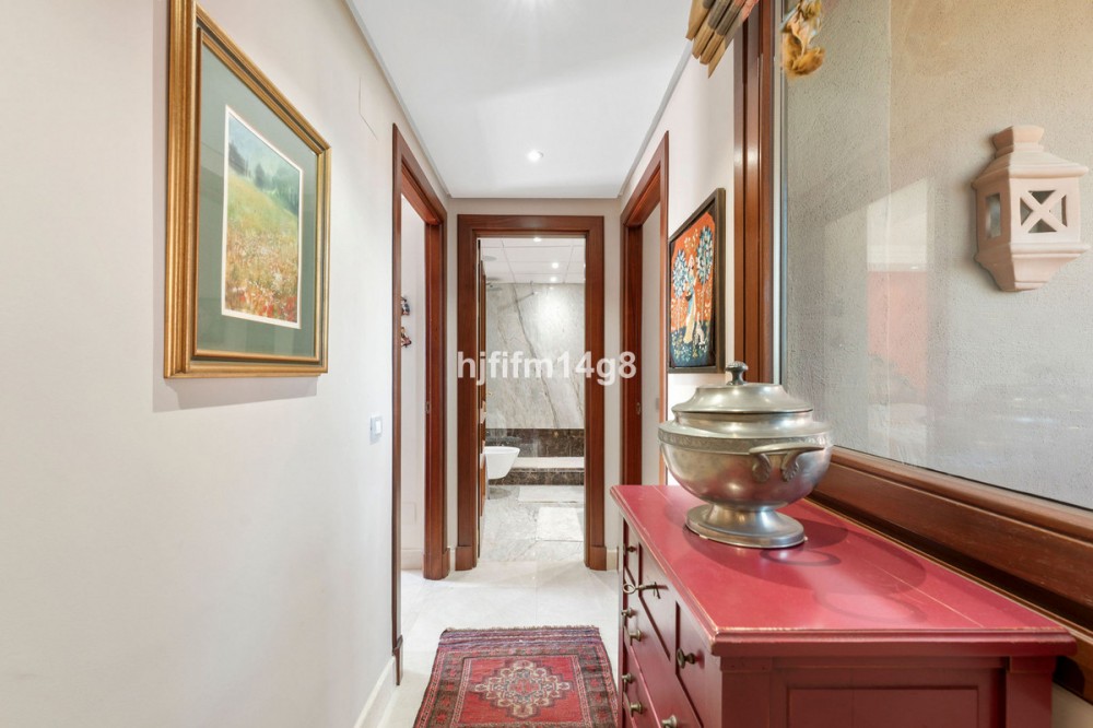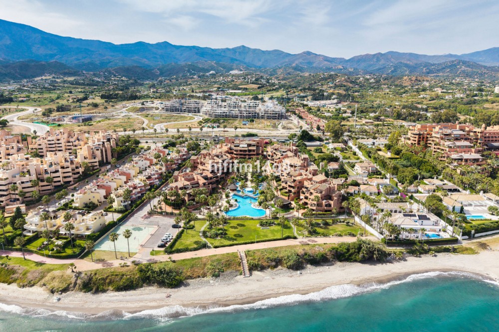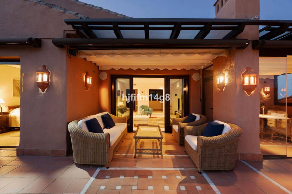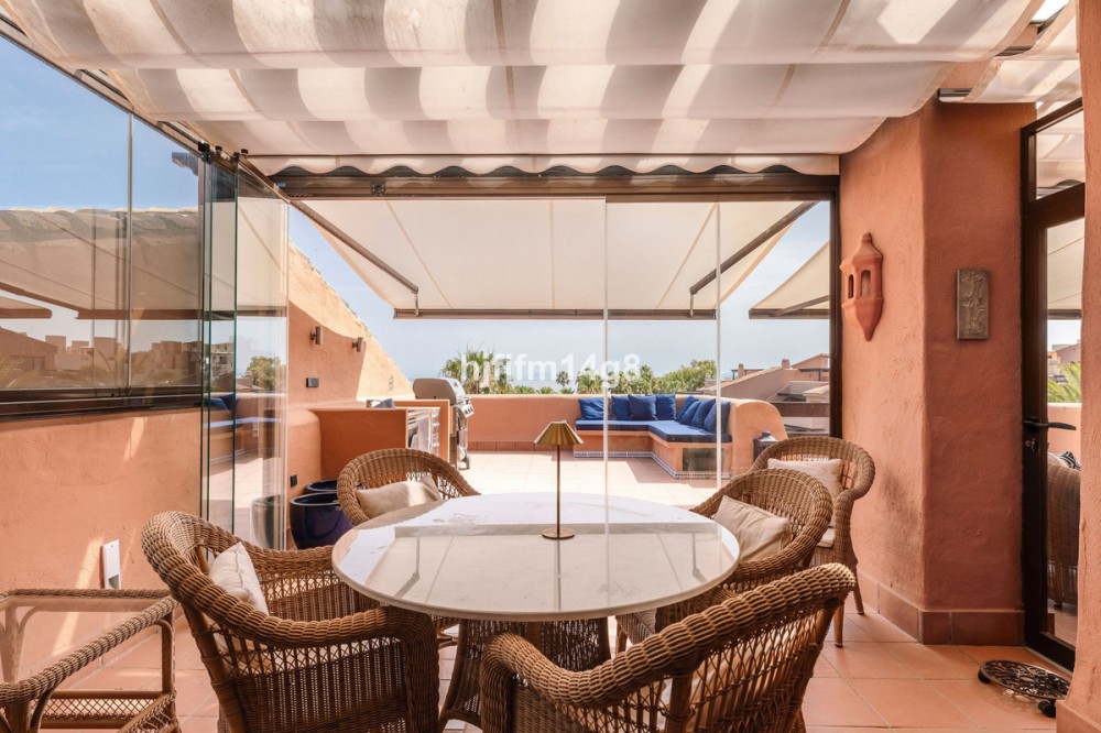 • This exceptional 3-bedroom penthouse in Mar Azul, Estepona, offers a luxurious coastal lifestyle, combining elegance, comfort, and breathtaking sea views. Located on the sought-after New Golden Mile, Mar Azul is a prestigious beachfront urbanization next to the renowned Kempinski Hotel. Residents enjoy direct beach access and are just minutes from high-end boutiques, cafés, and restaurants. The charming Estepona town centre is only a 5-minute drive away. Just ten-minutes walk to luxurious Laguna Beach with several restaurants. One of the standout features of this unique penthouse is that it is built entirely on one level, offering ease of living and a seamless flow throughout the home. The highlight is the unusually large southwest-facing terrace, accessible directly from the living room. This expansive outdoor space includes a lounge area, space for sunbeds, and a glazed corner dining area that can be opened or closed depending on the season — ideal for year-round use and entertaining. Additionally, the apartment and terrace are equipped with 8 integrated Sonos speakers, providing premium-quality sound throughout. Inside, the property welcomes you with a bright and spacious open-plan living and dining area, bathed in natural light through floor-to-ceiling glass doors. The refurbished modern, fully fitted kitchen is equipped with high-end appliances, offering both functionality and style. Underfloor heating and aircondition in all rooms. There are three generously sized bedrooms, one of them in-suite and the other two sharing one bathroom. Providing comfort and privacy for family and guests alike. Two of the bedrooms has directly access to separate outdoor space. Additional features include two underground garage spaces, ensuring secure parking and two store rooms. From the garage there is an elevator with direct access to the entrance of the apartment. Interior 112m2, plus terrace 72 m2. The community of Mar Azul offers resort-style amenities, including several outdoor swimming pools, an indoor heated pool, a fully equipped gym, spa, and sauna. The complex is gated with 24-hour security, ensuring peace of mind and an exclusive living environment. This remarkable penthouse, with its rare single-level layout, expansive terrace, and unbeatable southwest orientation, represents a rare opportunity to enjoy true beachfront luxury between Marbella and Estepona.