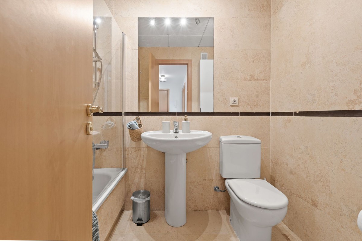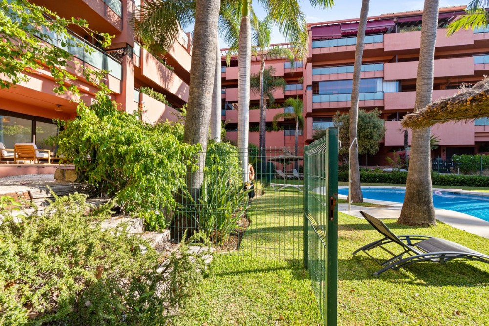 - Ground Floor Apartment for Sale in the New Golden Mile Discover the perfect coastal retreat in this spacious ground floor apartment located on the sought-after New Golden Mile, just a stone's throw from the beach(100 meters). With a generous total area of 163 m², this property features two well-appointed double bedrooms and two large bathrooms, making it ideal for families or those seeking extra space. The exquisite living and dining room opens to two semi-covered terraces, perfect for enjoying the Mediterranean climate. Step outside to your private garden, complete with a staircase leading to lush communal tropical gardens. Enjoy the luxury of outdoor saltwater swimming pools and a range of complex amenities, including a gym, sauna, jacuzzi, and a large heated indoor pool. The apartment also includes a spacious kitchen, laundry room, and ample storage in the basement, along with a private garage space for your convenience. With a fantastic orientation to the east, this apartment is bathed in natural light throughout the day. Additional features include electric central heating, air conditioning, and built-in wardrobes. Located in a well-maintained urbanization with plenty of parking spaces outside, this property is a perfect blend of comfort and luxurity.