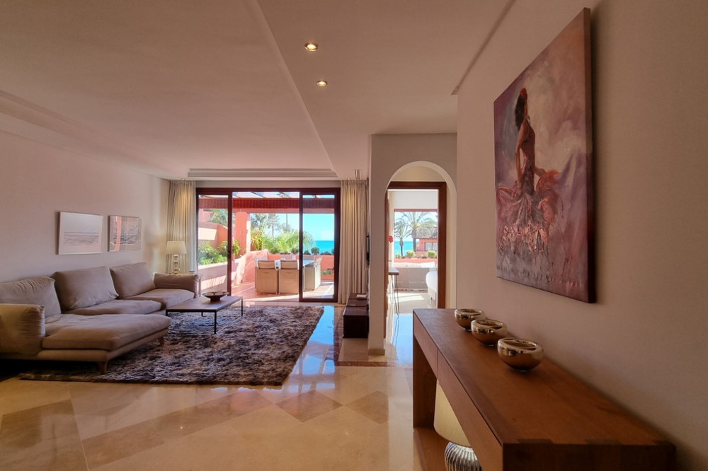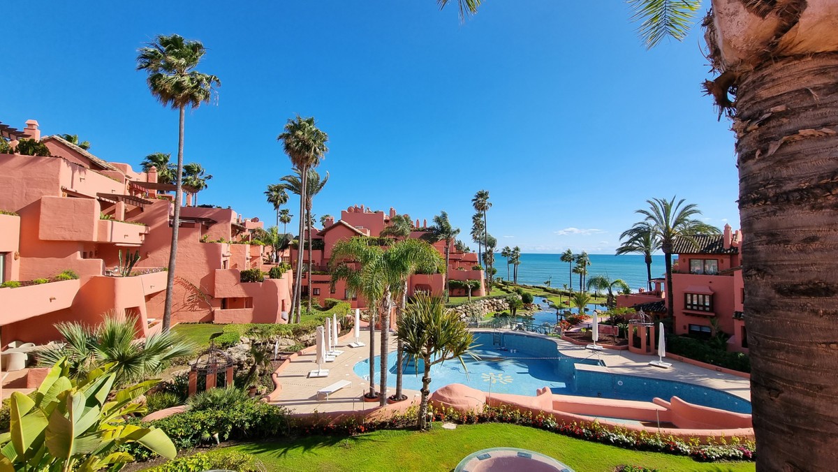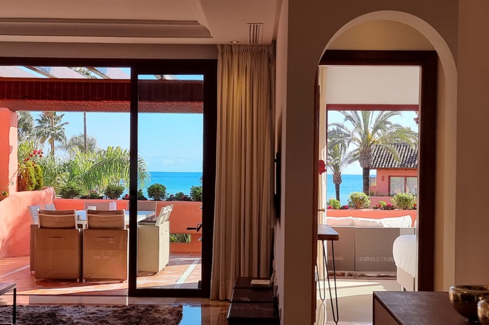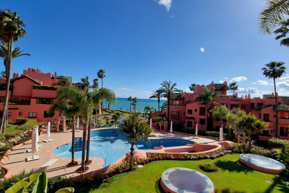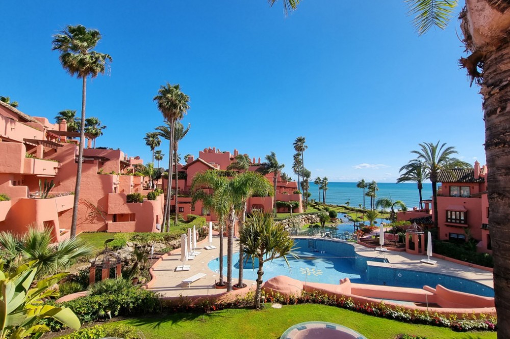- Estepona – Beachfront Luxury in a 5-Star Resort- CABO BERMEJO Experience coastal living at its finest with this beautiful and spacious 2-bedroom, 2-bathroom first floor apartment boasting breathtaking sea views in one of Estepona’s most exclusive beachfront resorts. The property is thoughtfully laid out and features: Elegant entrance hall leading to a fully equipped kitchen with service area A bright and spacious living room with access to a large terrace overlooking the Mediterranean Two generous bedrooms, each with its own private terrace — one facing southeast and the other northwest Designed for comfort, the apartment includes individual hot/cold air conditioning in every room and underfloor heating throughout. A private garage space is also included. Set within a prestigious 5-star resort, residents enjoy lush tropical gardens, swimming pools, ornamental lakes, direct access to the beach, 24-hour security, controlled entry, gym, and sauna. This exceptional property combines luxury, comfort, and an unbeatable beachfront location — a true gem on the Costa del Sol.