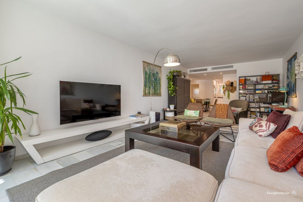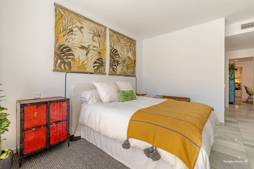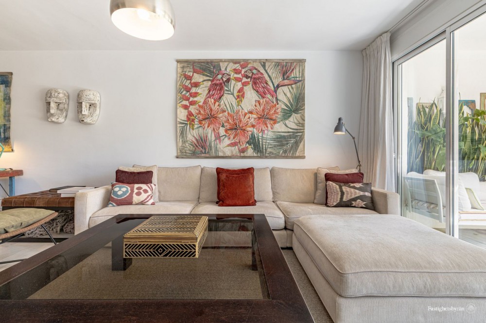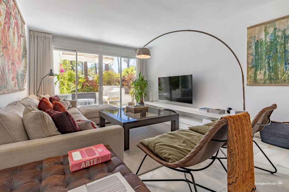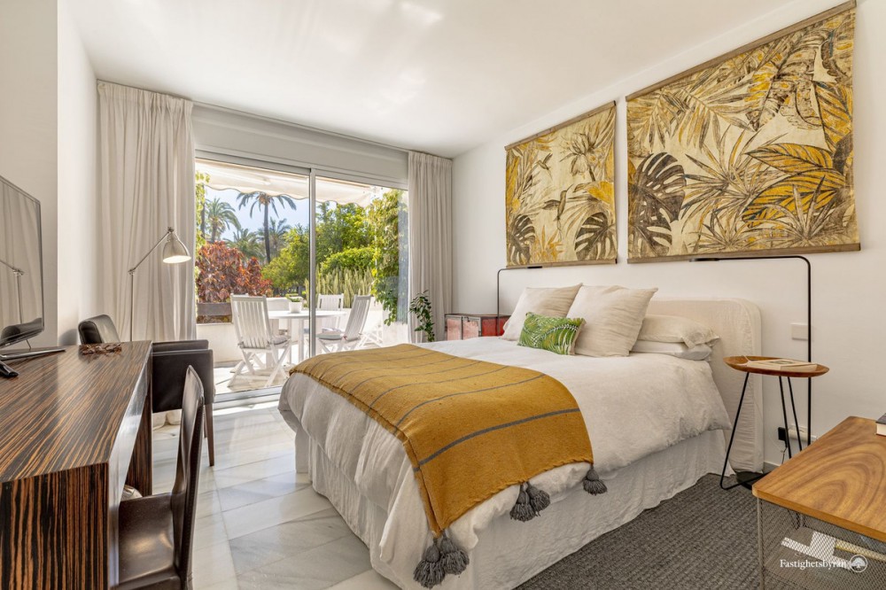 - Alcazaba Beach magnificent apartment with large terrace, garden, swimming pool and partial views to the Mediterranean, in exclusive beachfront urbanization, with direct access to the beach, beach bar and restaurant on site, communal parking, 24 hour security, beautiful tropical gardens very well kept, 6 swimming pools (one heated), tennis and paddle courts. It is located on the outskirts of Estepona, with all kinds of services around and only 5 minutes drive from the marina and 10 minutes from Puerto Banus. The spacious layout includes two large bedrooms with fitted wardrobes, and two bathrooms, the property has been renovated and the living room and kitchen have been distributed in an open plan layout for a feeling of spaciousness. Its large terrace offers incredible views but provides great privacy thanks to the lush vegetation of the area and thanks to its south west orientation it enjoys light all day and magnificent afternoon sun. Great opportunity, the best option on the market, both as a first residence and as a holiday home to enjoy with family or friends. Must be seen!