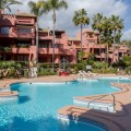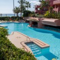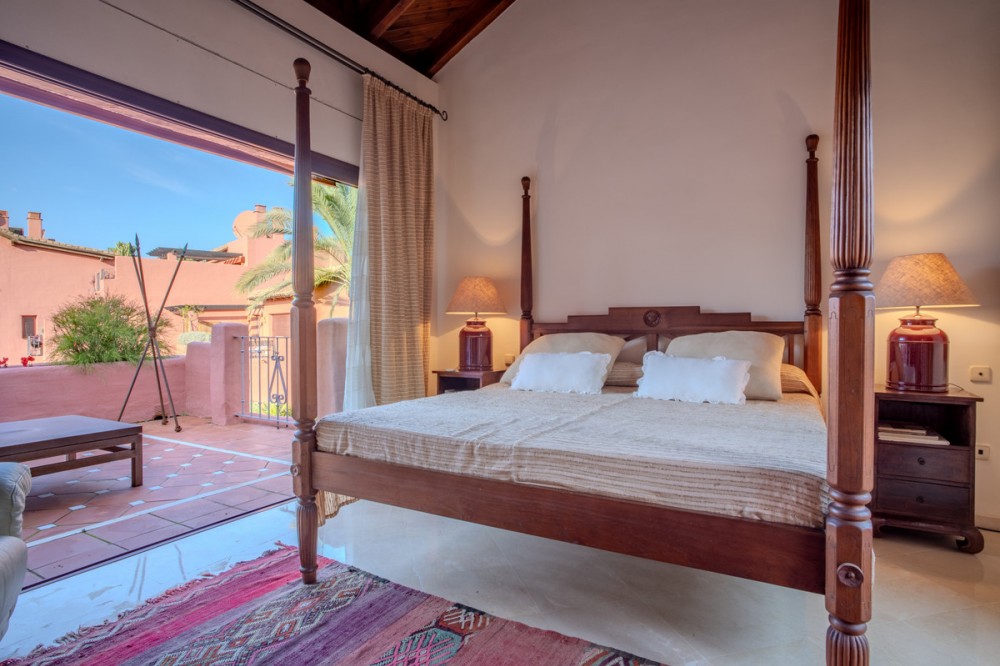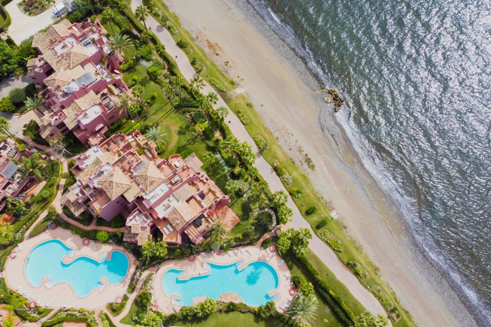 - Impressive three bedroom south facing duplex penthouse in the prestigious and gated beachfront community Menara Beach, Estepona. This sought-after complex has well-kept tropical gardens, outdoor communal swimming pool, indoor heated swimming pool and gymnasium, as well as being just ten minutes’ drive to Puerto Banus and a short drive to shops, restaurants and all amenities. The property has an open plan living and dining area with patio doors leading to two private terraces with beautiful sea views; fully fitted kitchen with separate laundry area; guest suite with access to the terrace; guest bedroom; and a guest bathroom. The upper-level leads to the impressive master suite with vaulted ceilings and a private terrace; on this level there is an additional large terrace with BBQ area and stunning views of the community and sea. Other features include fitted wardrobes throughout, marble floors, hot and cold air conditioning, underfloor heating in the bathrooms, private parking and store room.
